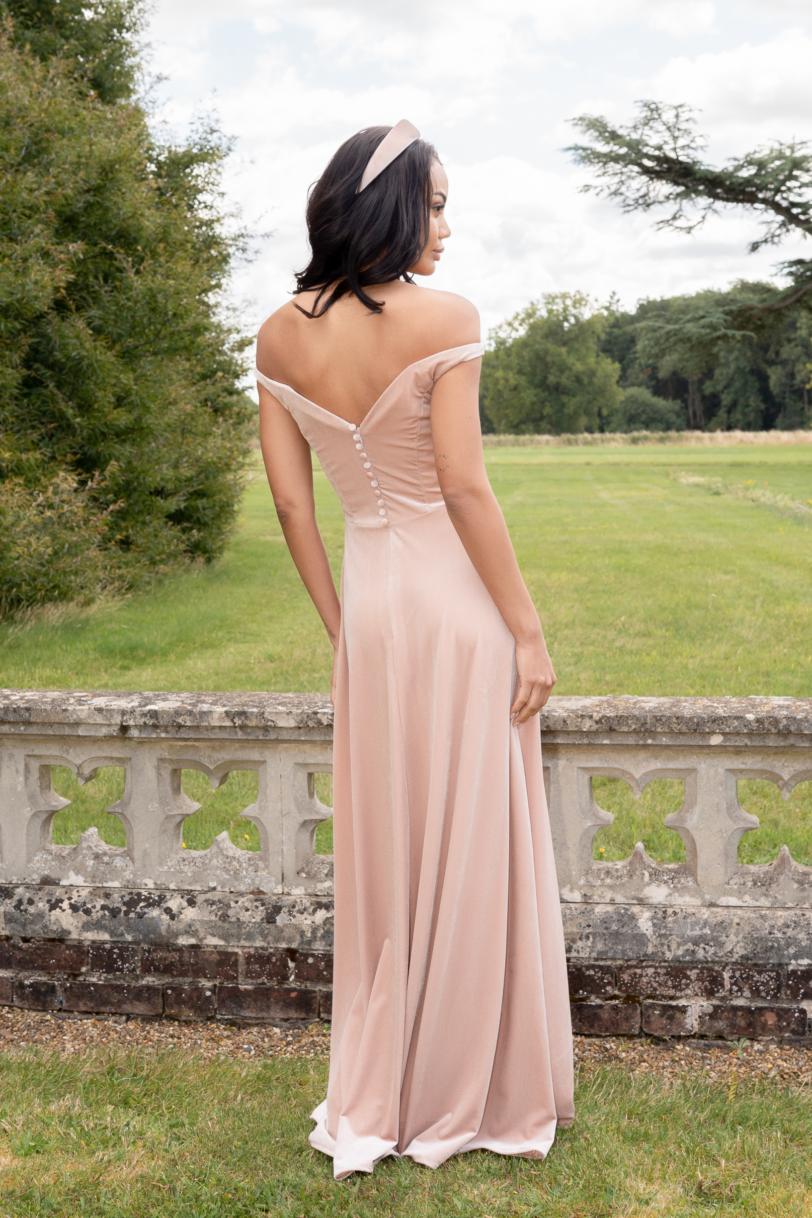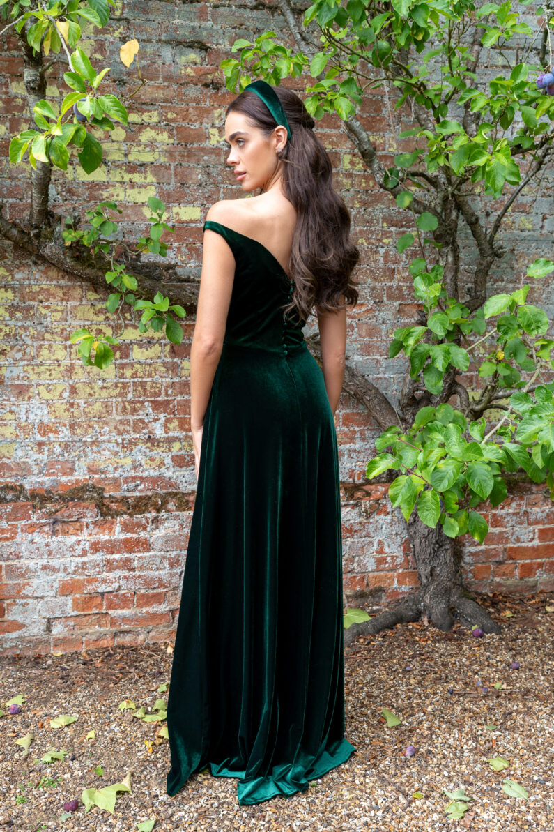 Our A-line Velvet dress is so sophisticated. It has a flattering sweetheart neckline with grazing-the-shoulder straps and a V-neck back, complemented by Velvet covered buttons for show, from the back neck down to the waist. This dress fastens at the back with an invisible zip, is available in any of our Velvet colours, and is shown here in Peony and Emerald Green.