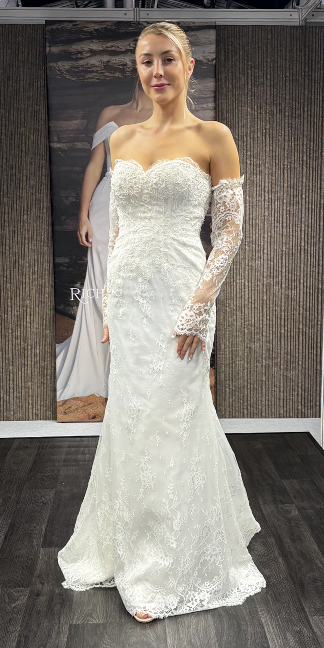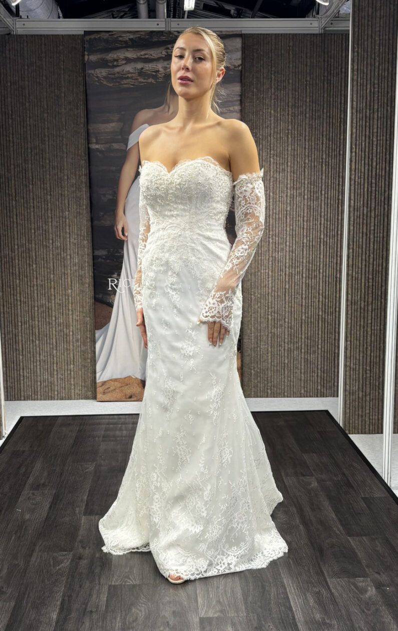 A modern-marvel, our dress Auburn uses the most delicate and detailed French lace. The flattering fit and flare skirt of this dress is perfectly finished with its long-established sweetheart neckline, and is brought right up to date with its gorgeous off the shoulder sleeves. This dress fastens at the back with an invisible zip, and features pearl buttons down the centre back, as an additional feature. This dress also comes with detachable matching lace sleeves, allowing you to change up your bridal look as you wish. This dress is available in Ivory only.