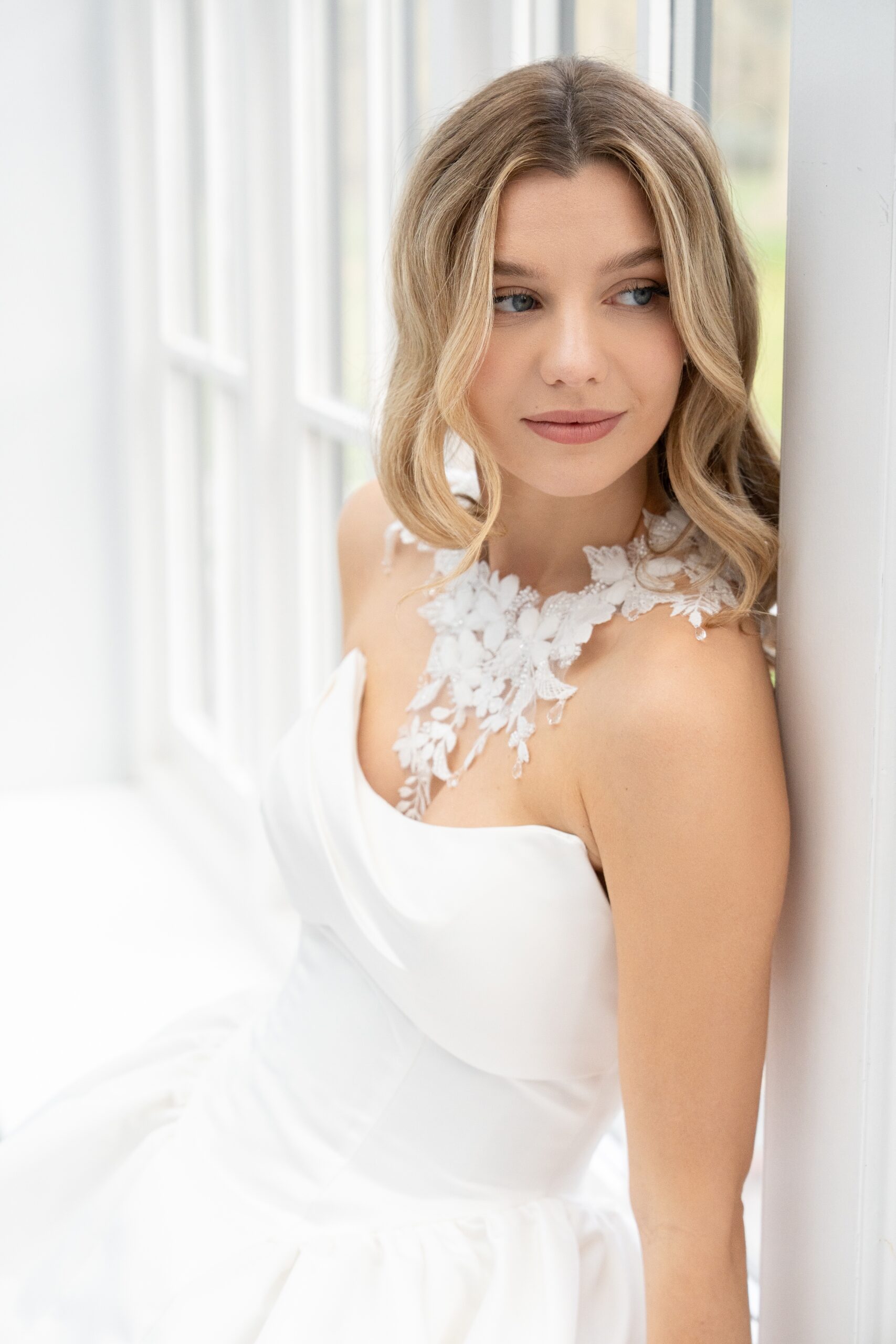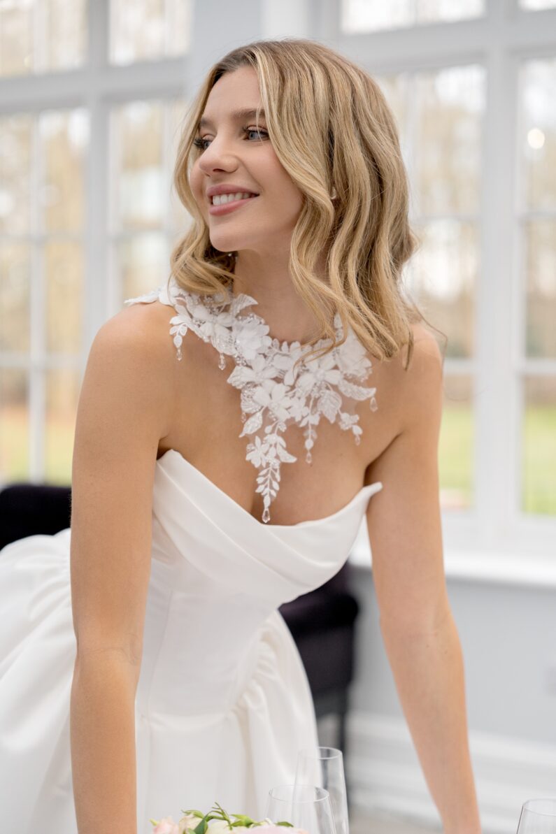 This intricate collar style choker is made up of exquisite textured lace appliques that have been carefully placed in a way that frames your neck and shoulders. Each applique has detailed beaded elements as well as 3D fabric floral petals, small crystal drops have been added to the edge of the choker for a hint of glamour and sparkle. The choker fastens at the back with a ribbon tie which has also been decorated with a small touch of lace and crystal drops.