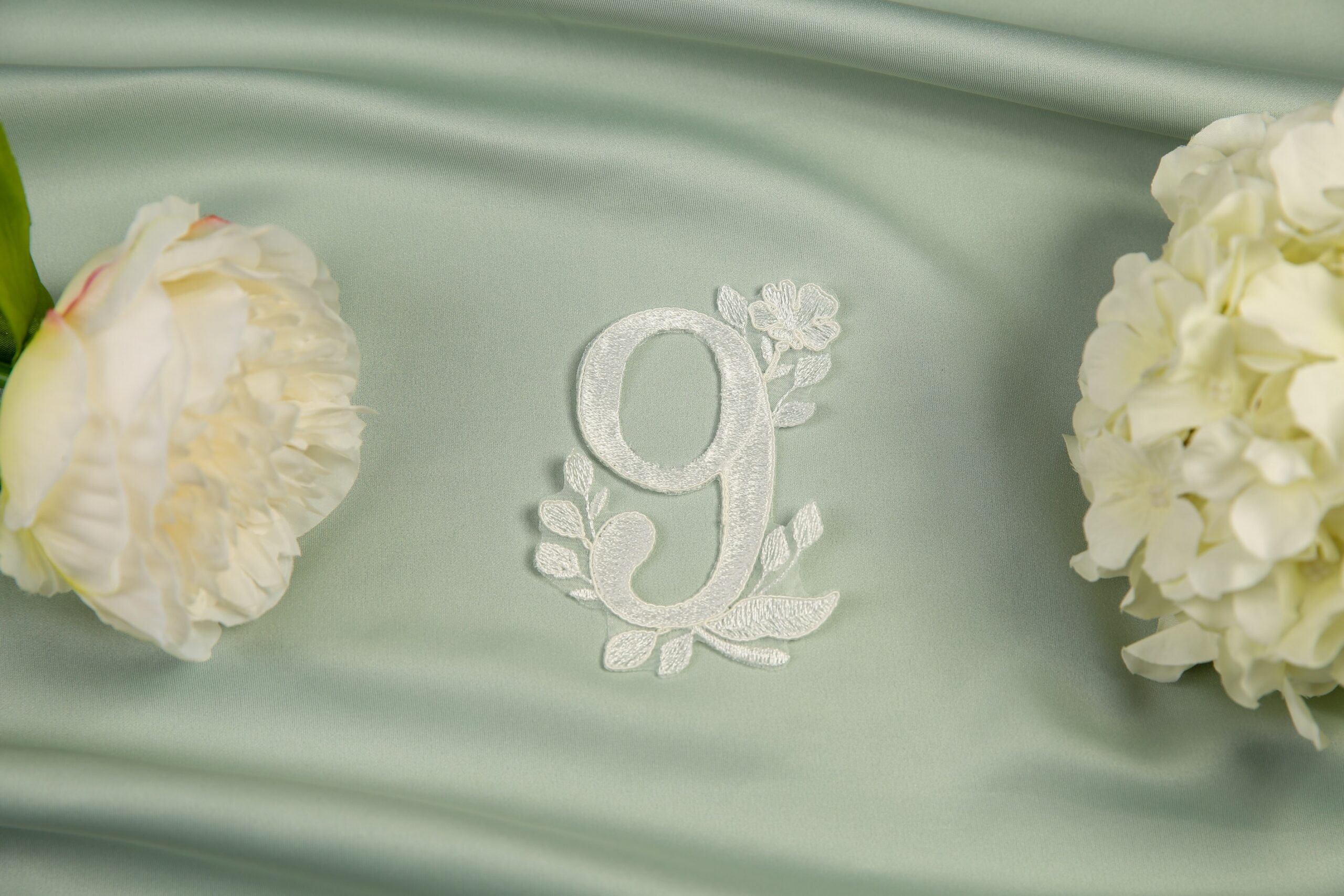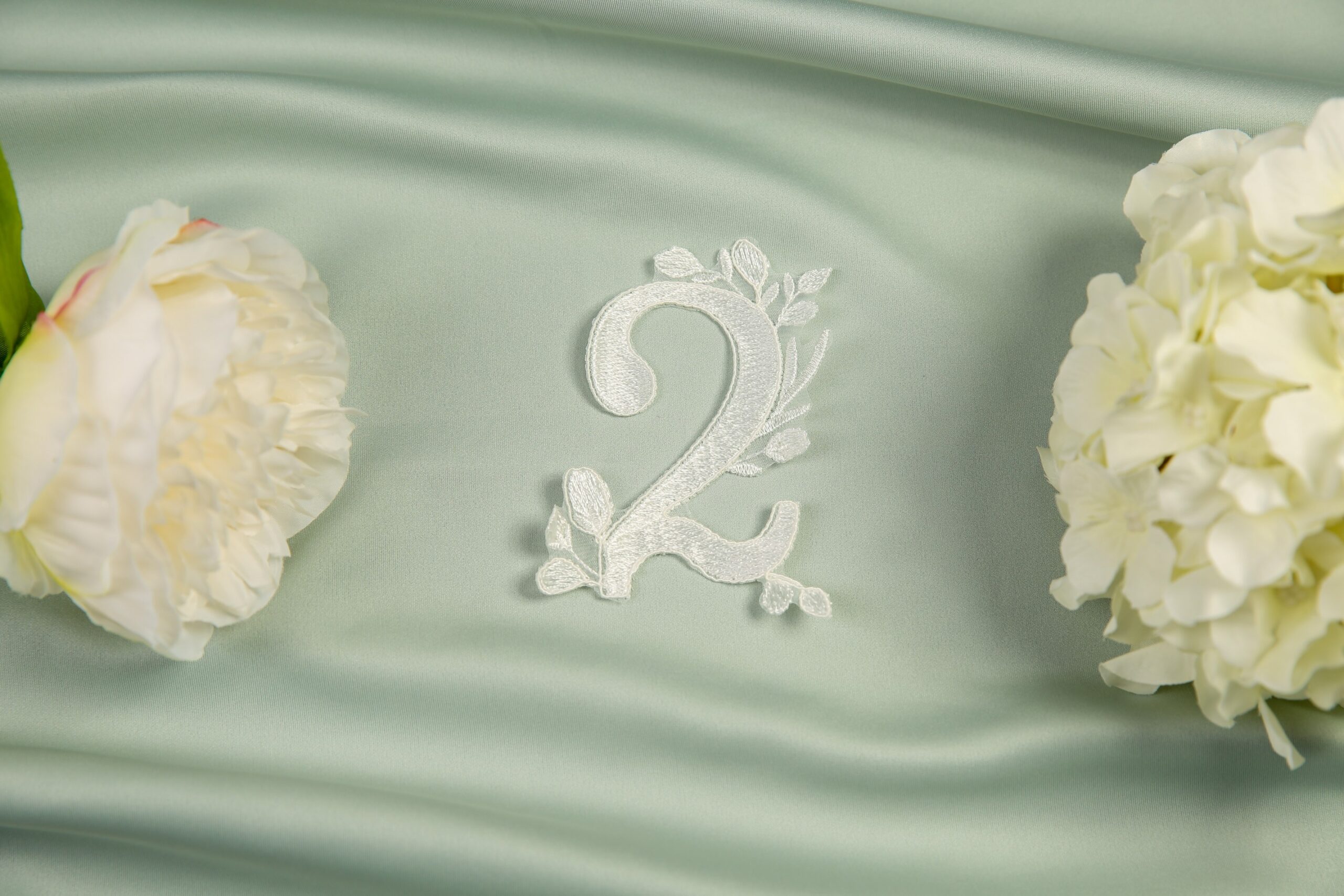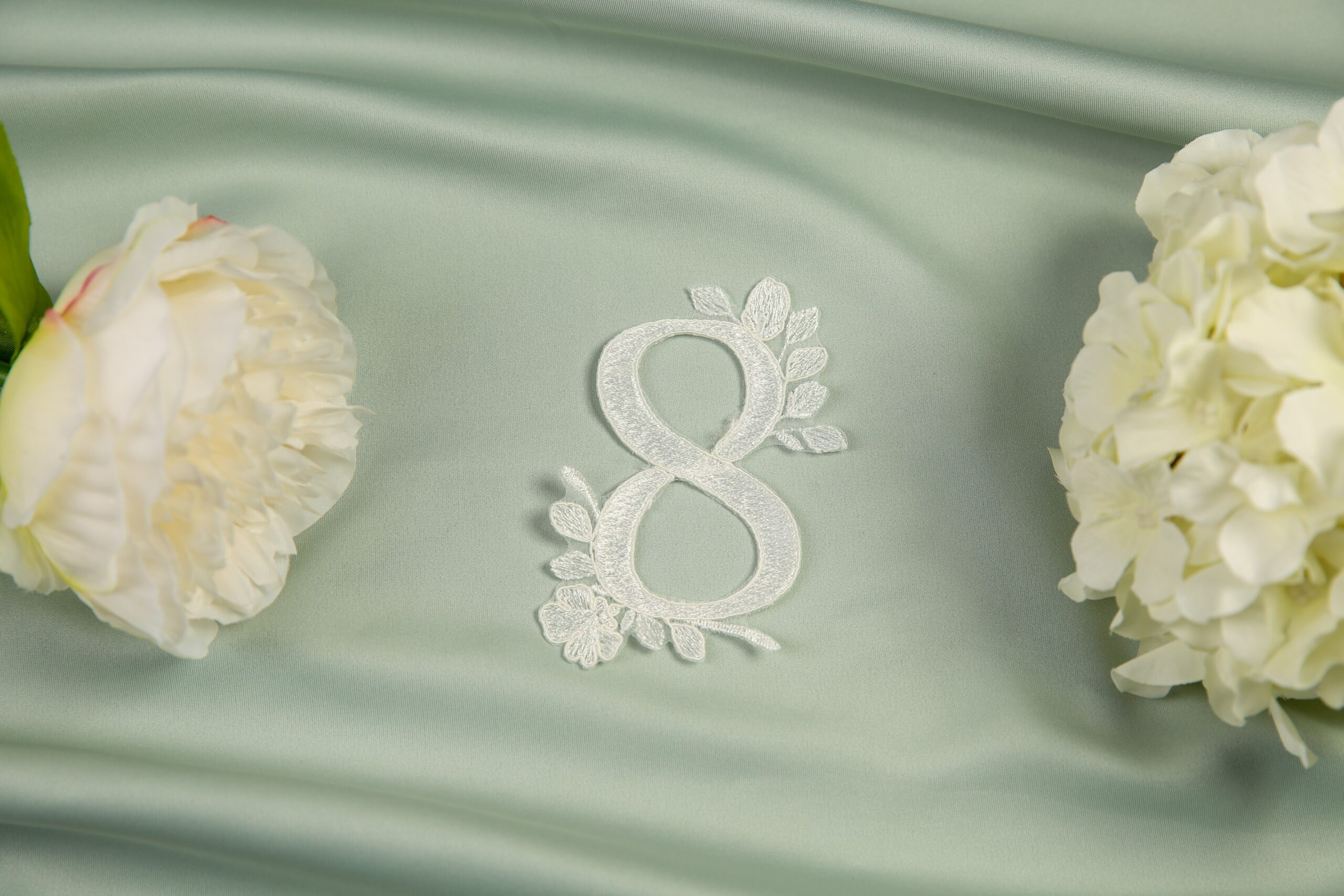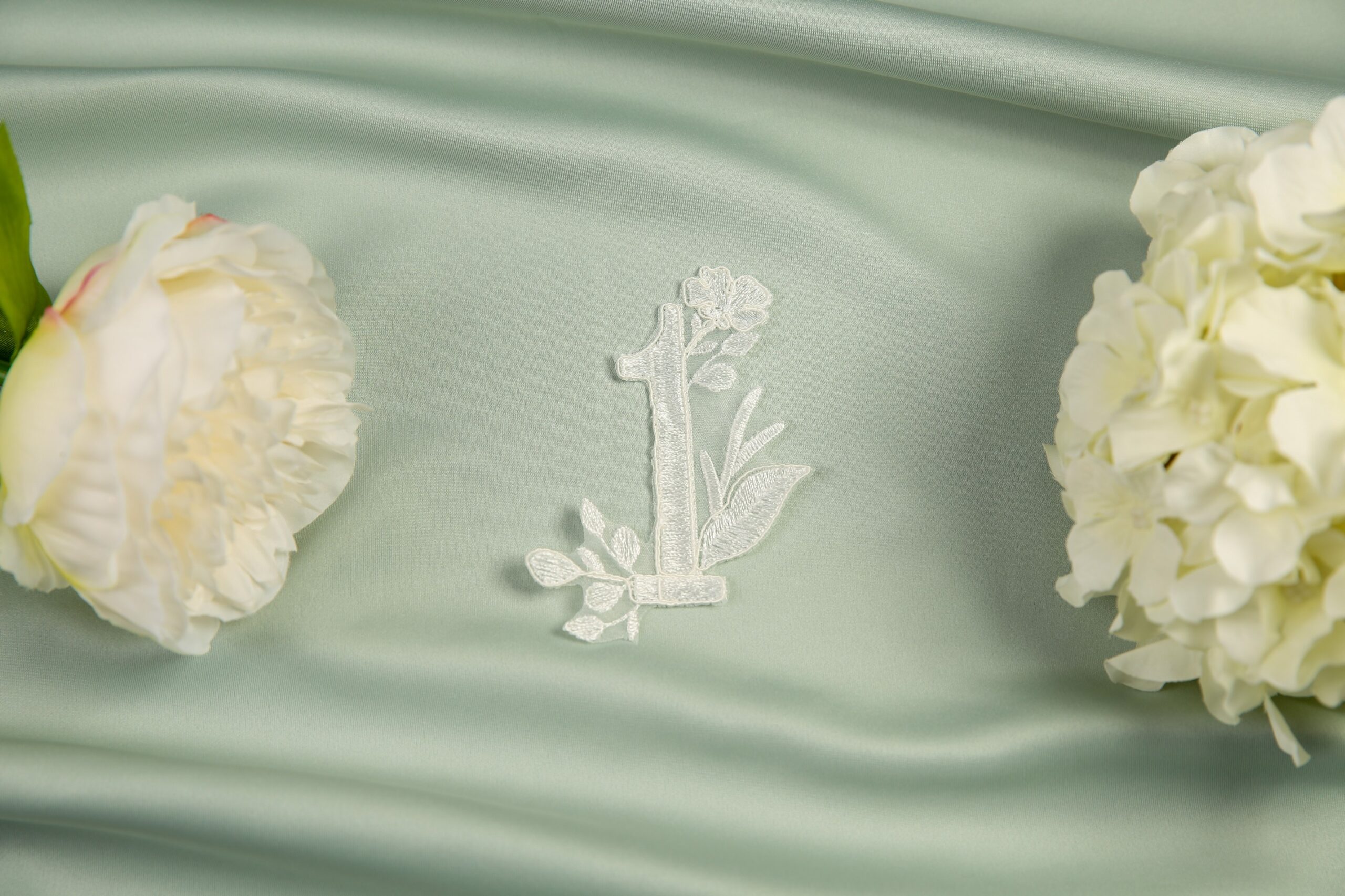 Reflect all of your love on your special day with this gorgeous modern veil. A timeless veil with an embroidered straight edge, paired with beautifully intricate lace appliques and half pearls. We have created a set of lace appliques, each reflecting a specific month of the year, allowing you to include those special dates on your big day. Choose up to four individual appliques. Complete with matching numeral motifs with a date of your choice. Shown here in our 98″ single tier with matching pair April and May. Available in any of our single tier and two tier lengths. If ordered as a two tier, blusher will have the straight embroidery edge continue.