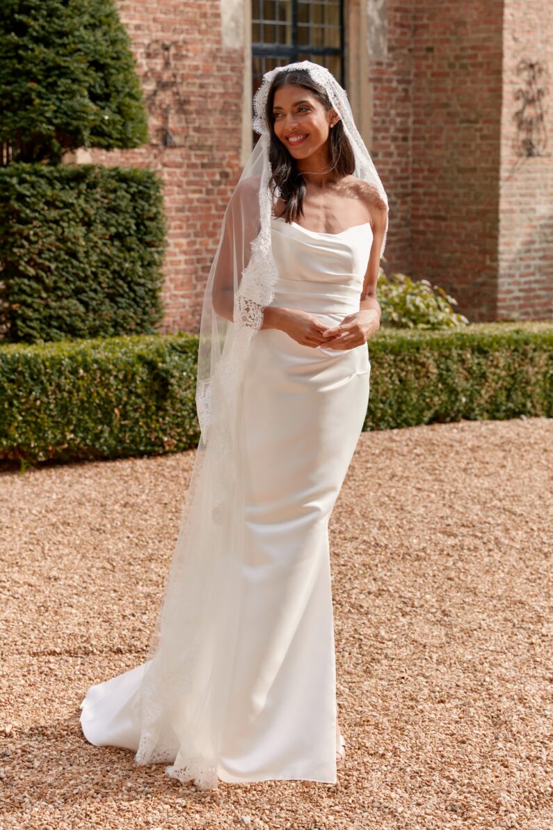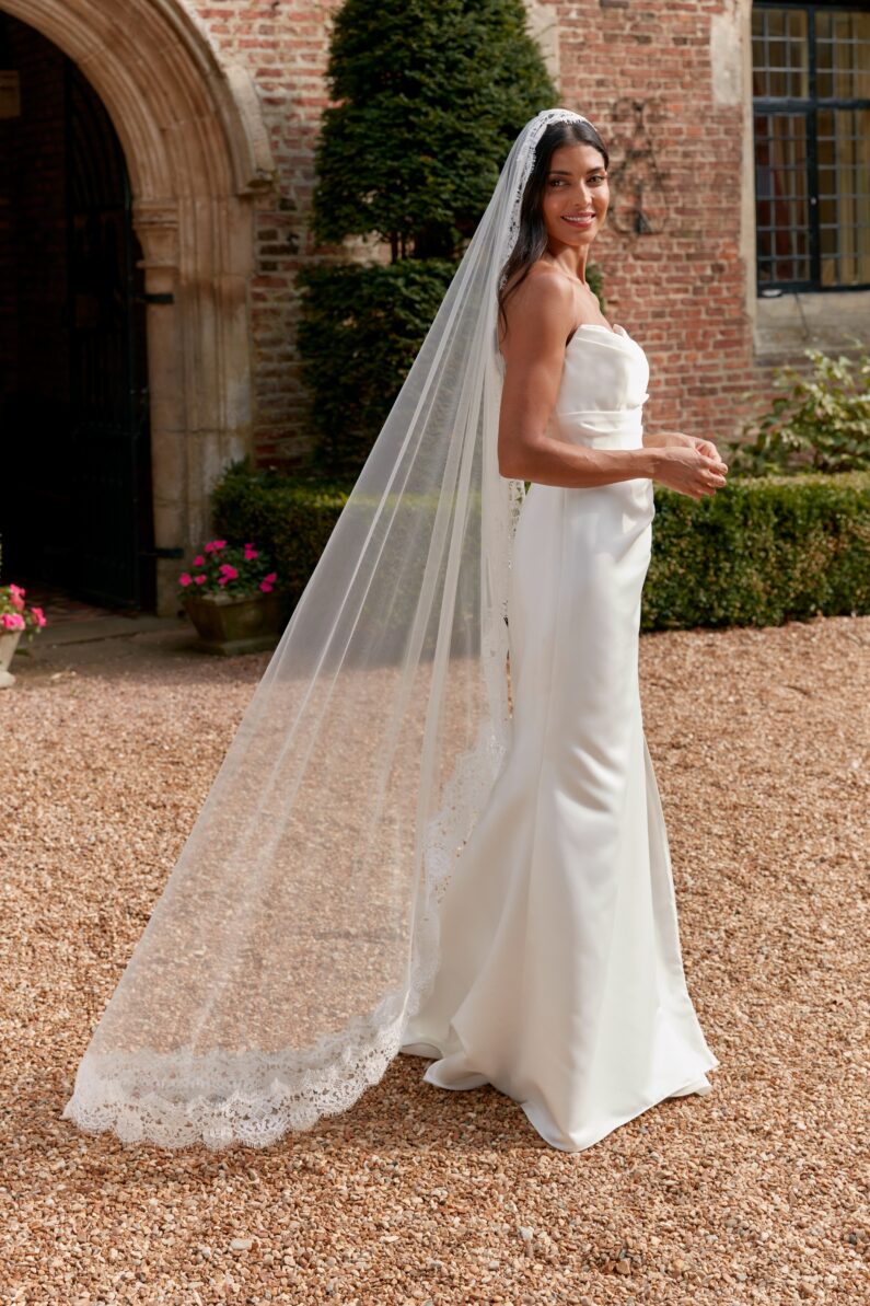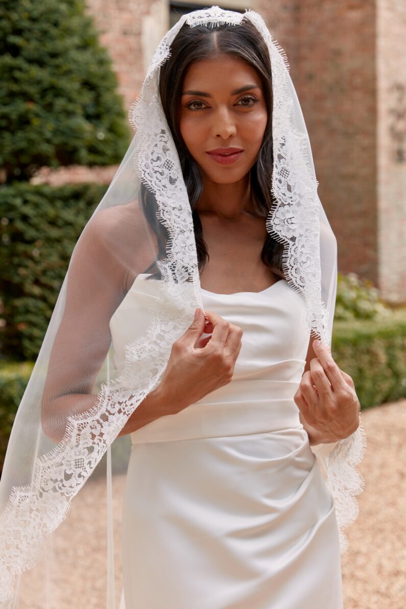 Elevate your bridal look with this stunning mantilla style veil, fully edged with gorgeous Chantilly Lace for a current and on-trend look. Perfectly pairs with Chantilly lace dresses, such as our Tallulah dress. Also adds a hint of luxury to plainer looks, without detracting attention from your dress. Available in any of our mantilla veil lengths. Shown here in a 72″ mantilla.
