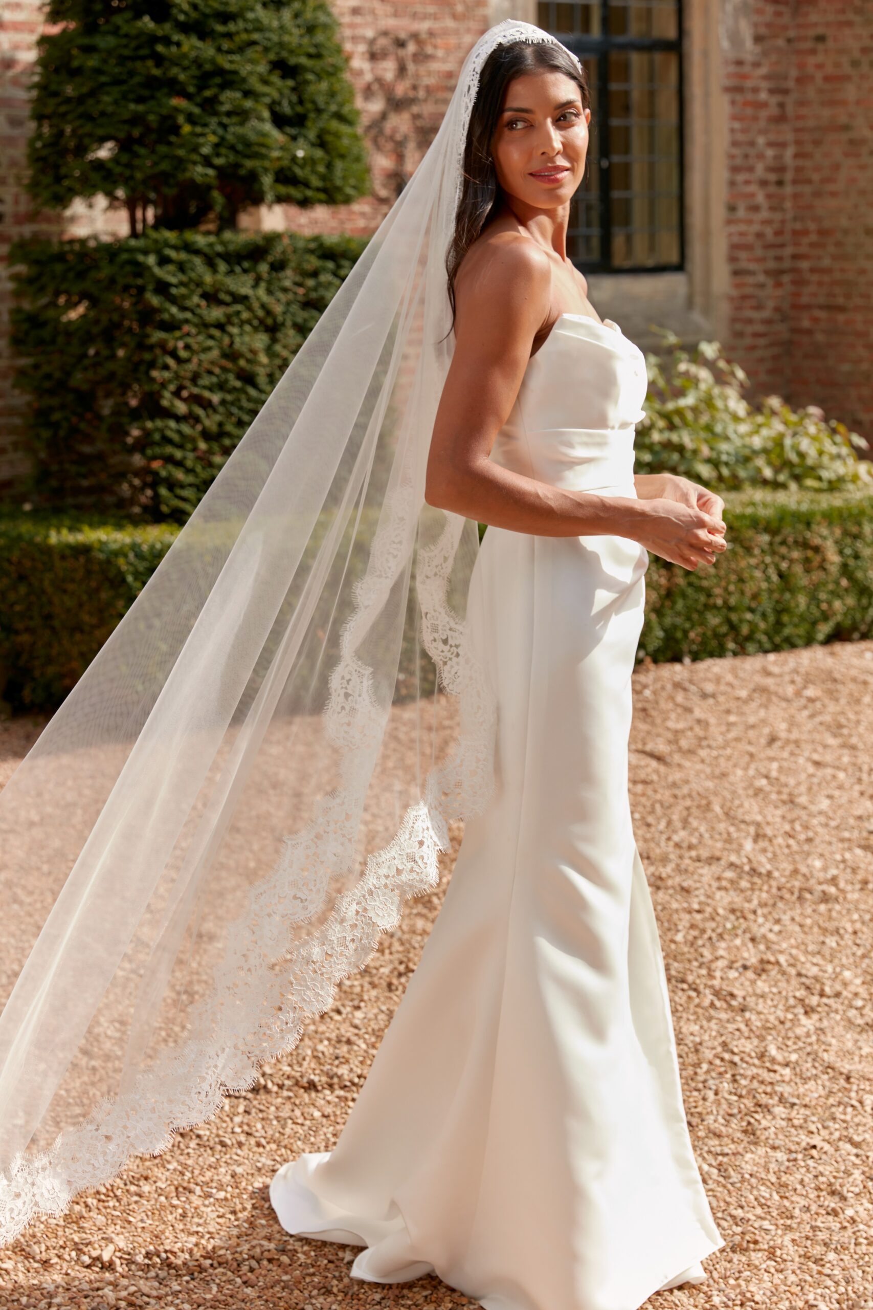 Elevate your bridal look with this stunning mantilla style veil, fully edged with gorgeous Chantilly Lace for a current and on-trend look. Perfectly pairs with Chantilly lace dresses, such as our Tallulah dress. Also adds a hint of luxury to plainer looks, without detracting attention from your dress. Available in any of our mantilla veil lengths. Shown here in a 72″ mantilla.