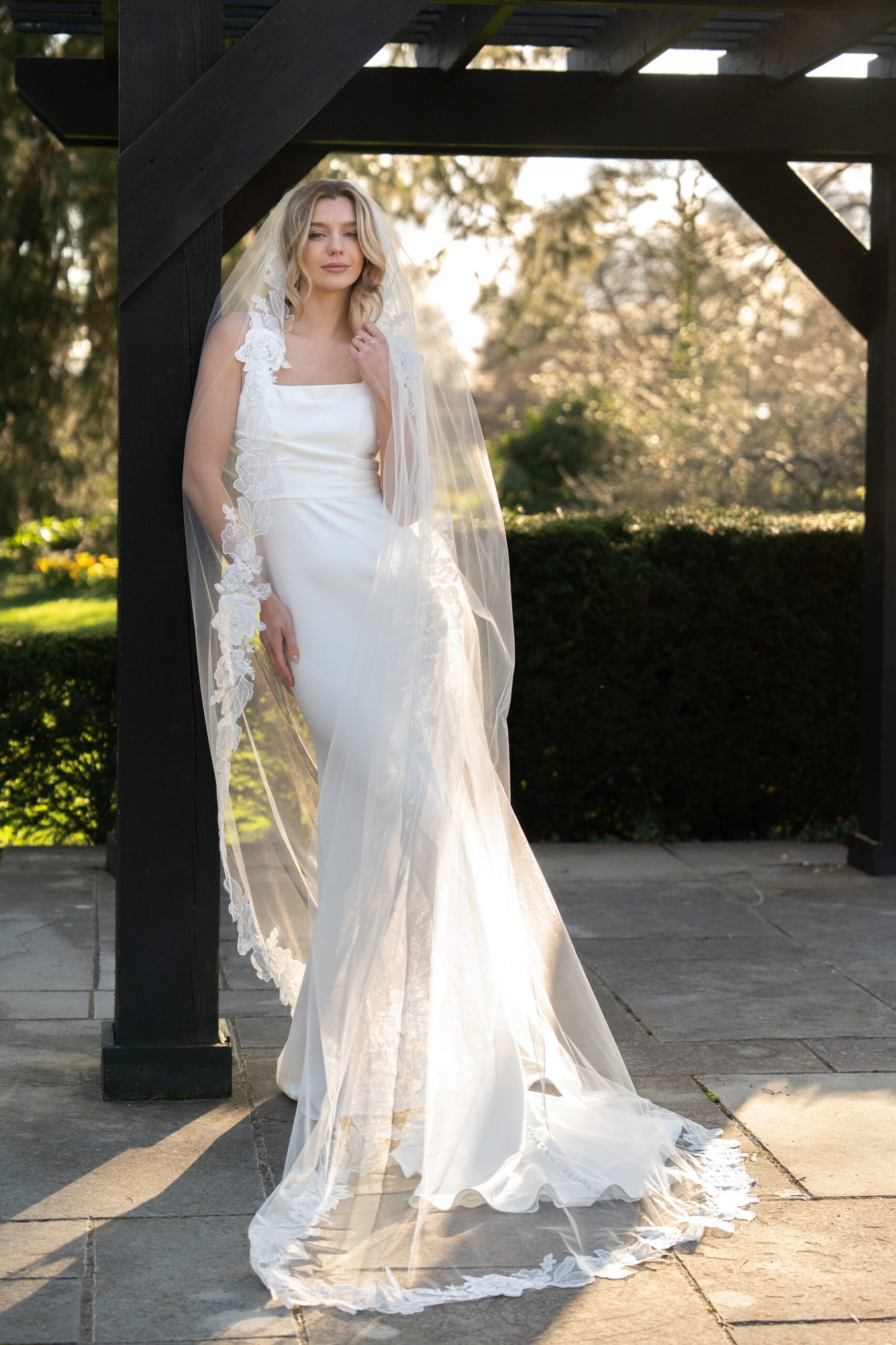 Combining delicate florals with bold beading this veil is a stand out accessory. The edge is made up of two stunning laces, one whimsical and dainty the other floral and adorned with stunning beading making it a veil suited to all bridal looks. Wear with sleek plain gowns for a picture perfect centrepiece or with more detailed gowns for a well thought out classic style. Available in any of our single tier or two tier veil lengths, shown in our 98″ single tier length.