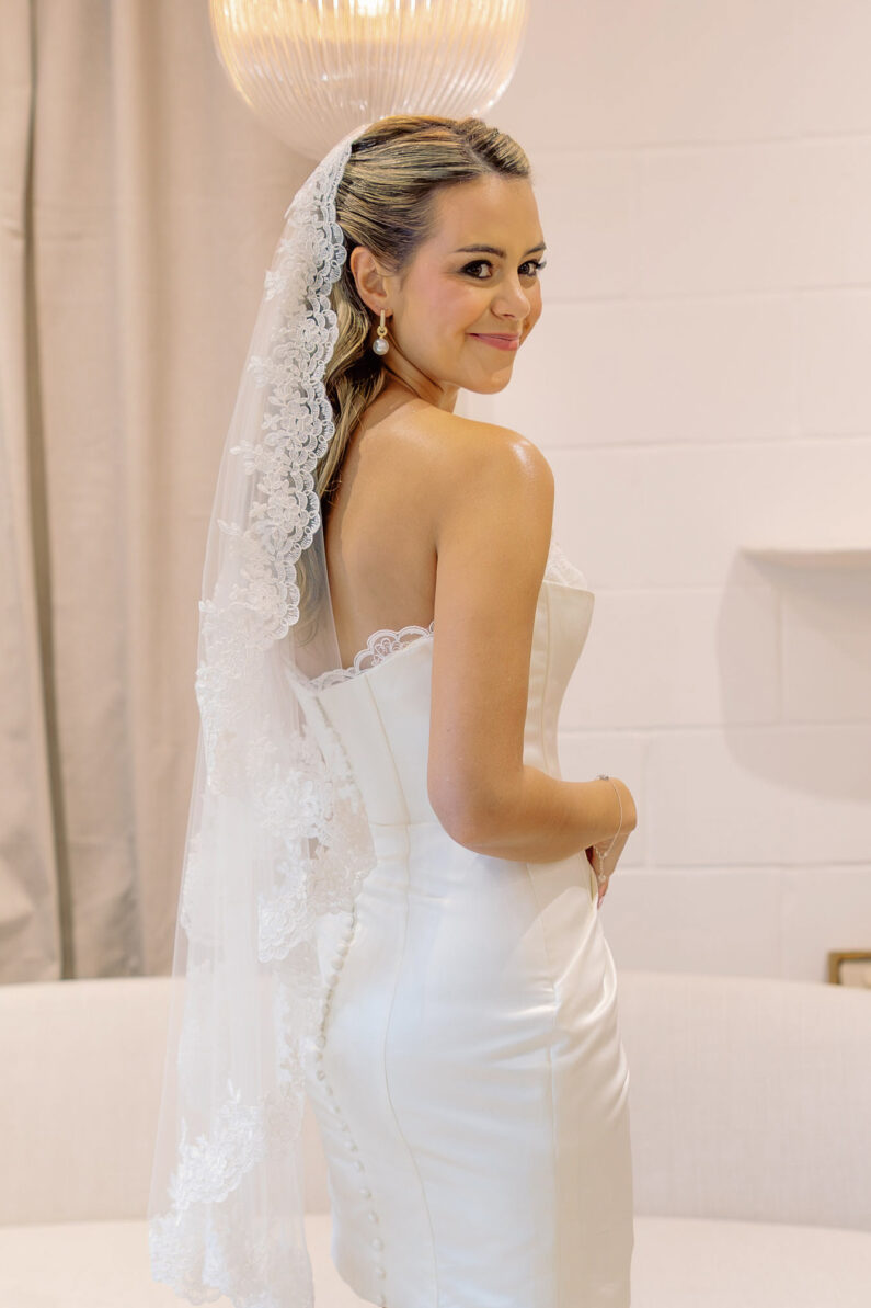 Choose either a single or two tier style for this veil. If two tier is chosen, the blusher will have the same detailing. Available in any of our signature tulle colours. Lace will always be Ivory. Shown here in our two tier 126″ length.