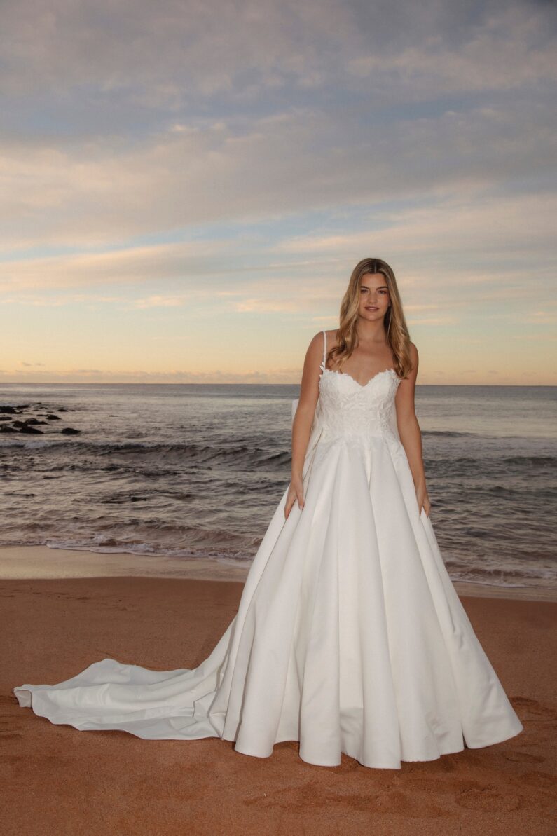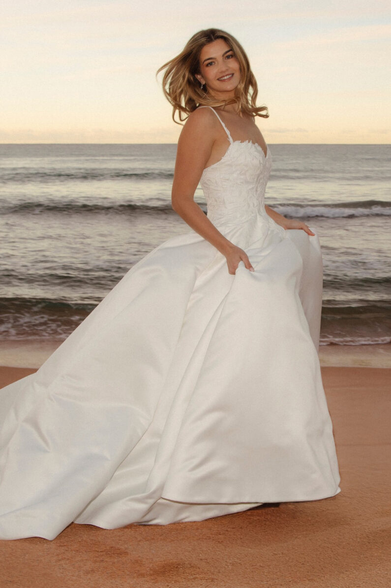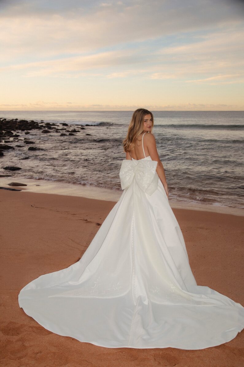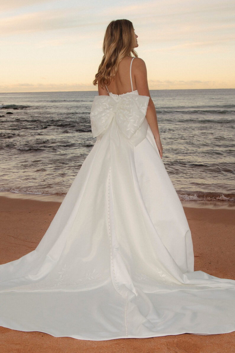 Our dress Lennox is perfect for the traditional bride. It has a gorgeous sweetheart neckline with spaghetti straps, and a billowing ballgown skirt. Detailed matte thread creates the floral vine Lace, adorning the bodice, whilst a dramatic double looped bow with exaggerated tails finishes it. This dress fastens at the back with a regular zip, and has pearl buttons as an extra detail from the back neckline, all the way down the centre back to the dress hem. This dress is available in Ivory only.