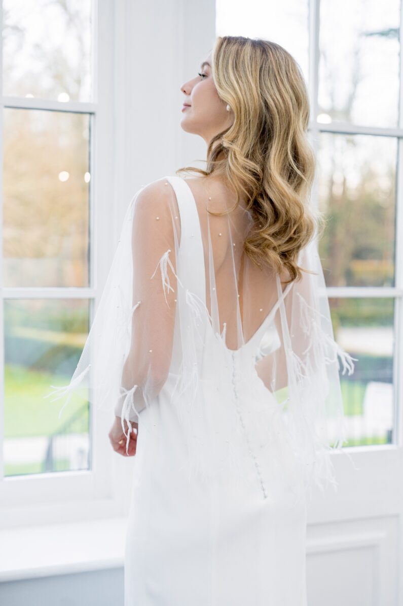 These off-shoulder tulle sleeves will be a great match for a boho inspired wedding. With carefully positioned beaded lace appliques, this will be a great way to incorporate glittering elements into your bridal look. Available to order in UK Sizes 4-32. Available as pictured in Ivory only.