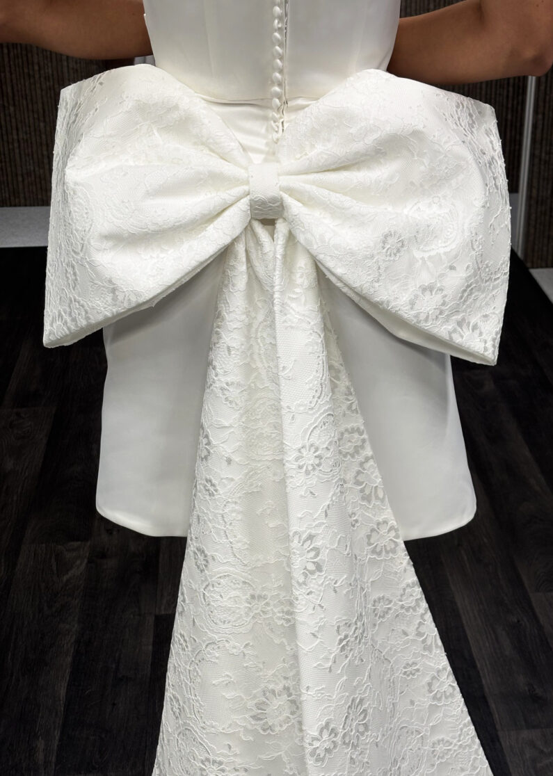 This season’s must have, perfect for that bride who wants to create an entrance. The perfect modern wedding accessory with the oversized bow, cleverly designed to be worn as a shrug with an added train. Available as picture in Ivory only.