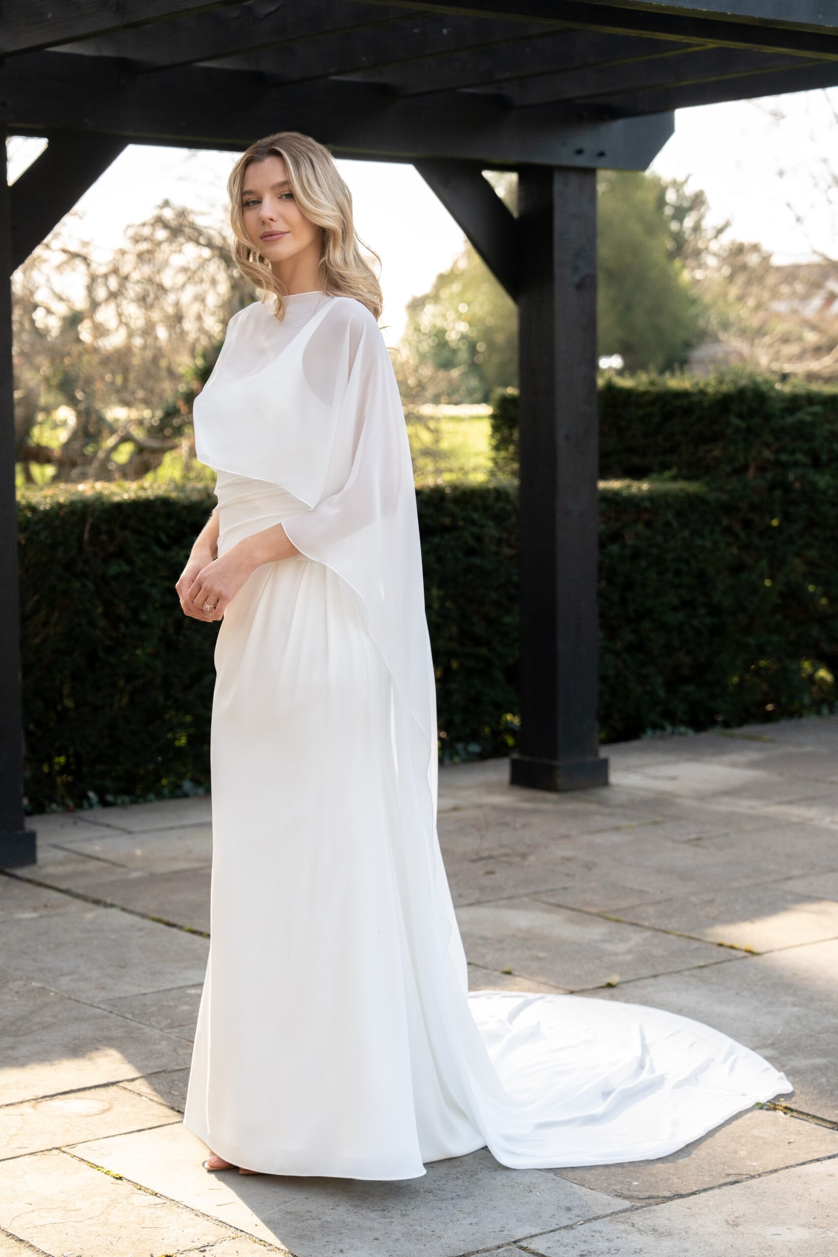Float down the aisle in our Tali chiffon cape, made from our luxurious chiffon which flows beautifully behind you as you walk. Wear with a matching chiffon gown to achieve some picture perfect moments. The front has been tapered to shape allowing your dress to still be visible, the back has a long flowing train and keyhole detail at the neckline, making it easy to change up your bridal look. Available to order in UK Sizes 4-32.