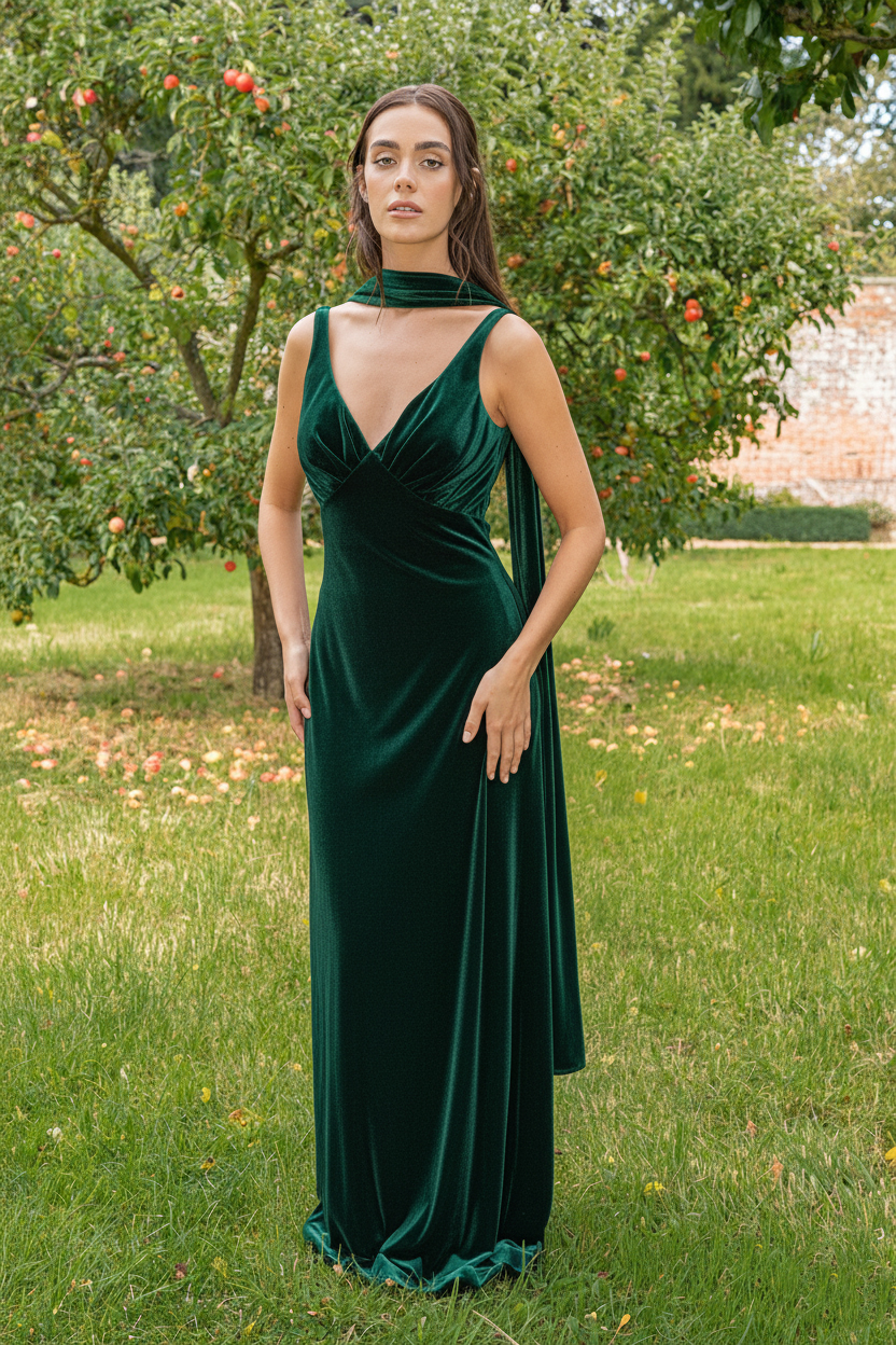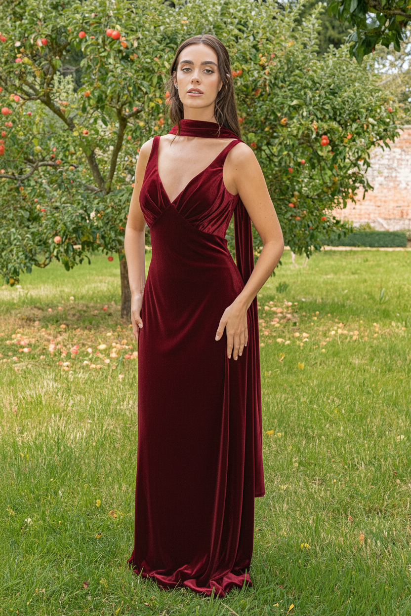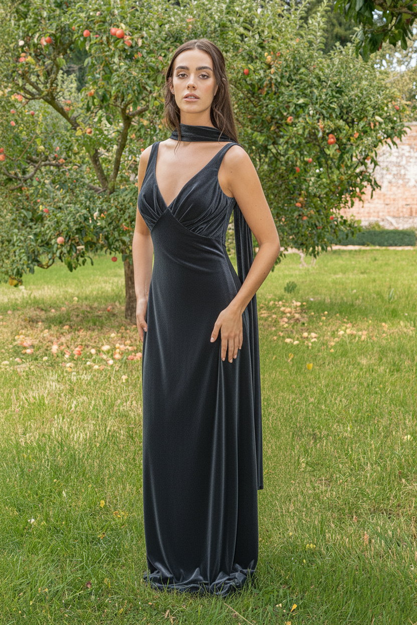 Velvet V-Neck Pleated Bust Column Dress