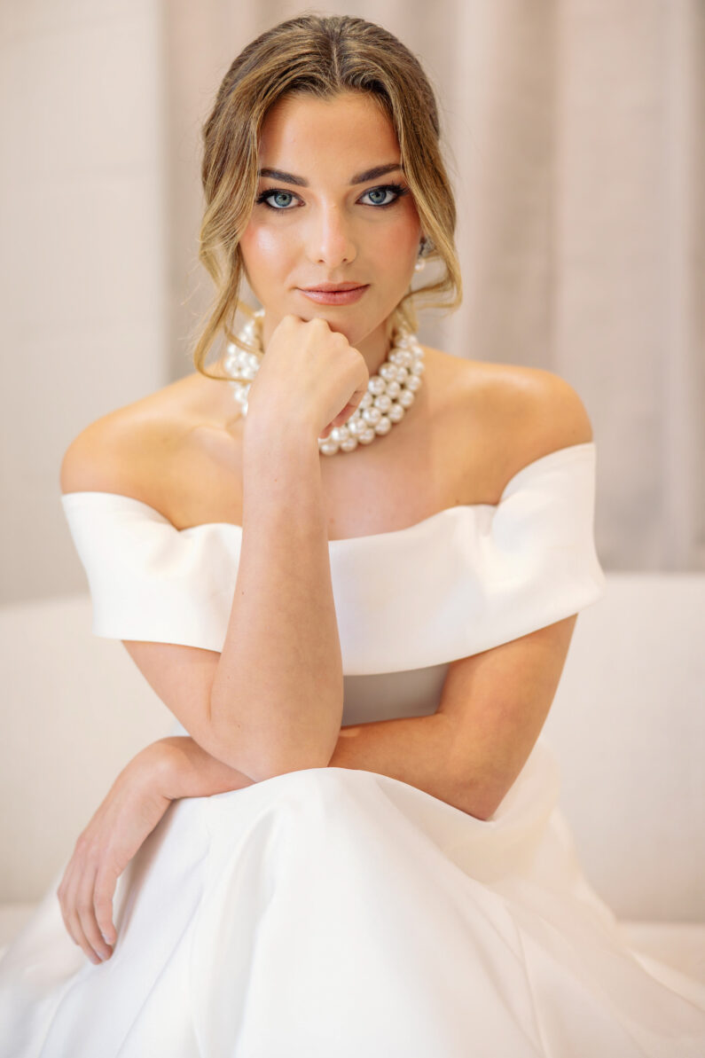 バービーをイメージしたこのパールチョーカーは、あなたのウェディングア衣装に最もエレガントな仕上げを与えます。 豪華な高級パールが3列に並び、調節可能なフィット感のための延長チェーン付きです。
