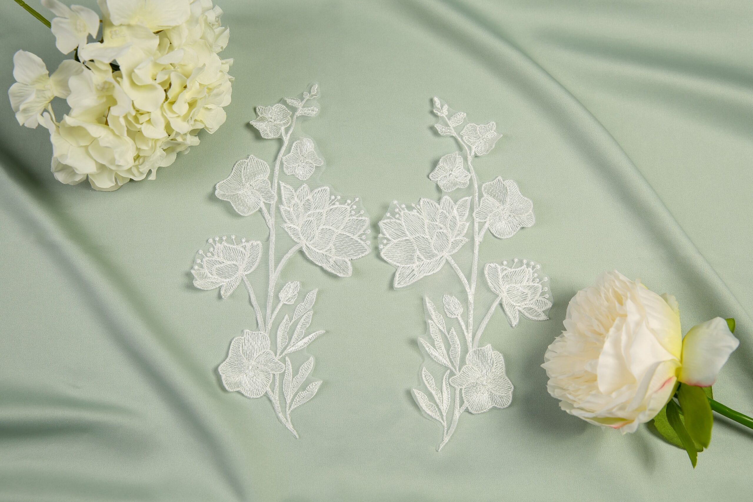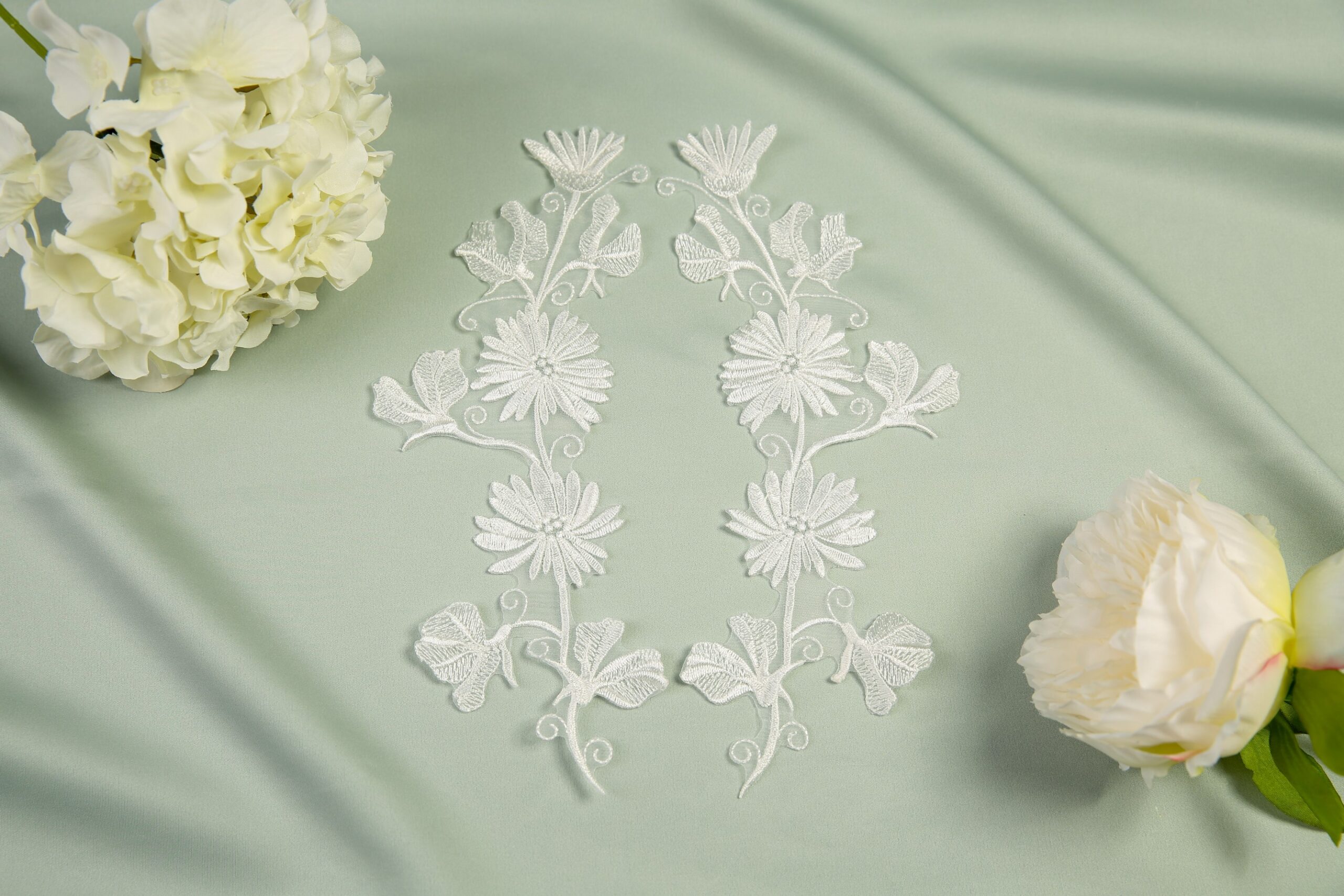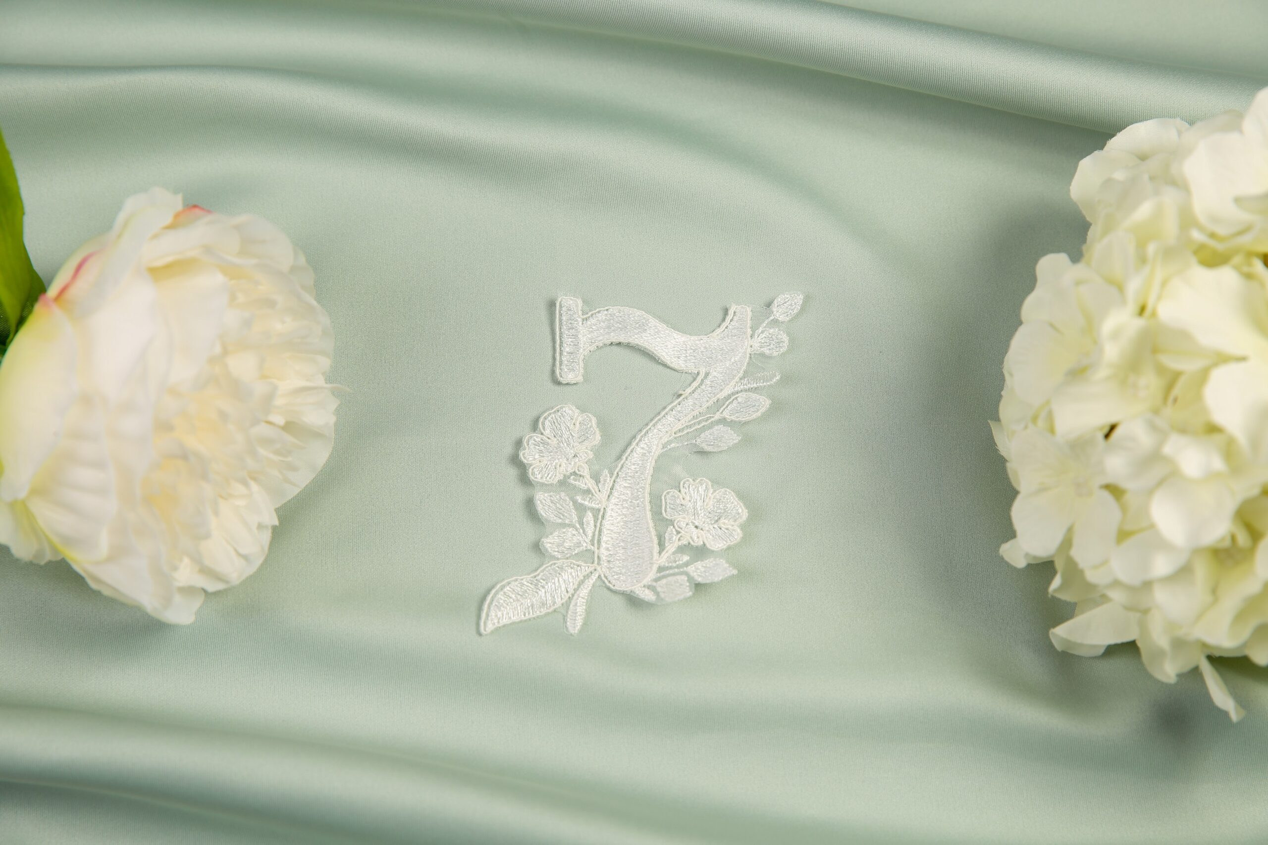 Reflect all of your love on your special day with this gorgeous modern veil. A timeless veil with an embroidered straight edge, paired with beautifully intricate lace appliques and half pearls. We have created a set of lace appliques, each reflecting a specific month of the year, allowing you to include those special dates on your big day. Choose up to four individual appliques. Complete with matching numeral motifs with a date of your choice. Shown here in our 98″ single tier with matching pair April and May. Available in any of our single tier and two tier lengths. If ordered as a two tier, blusher will have the straight embroidery edge continue.