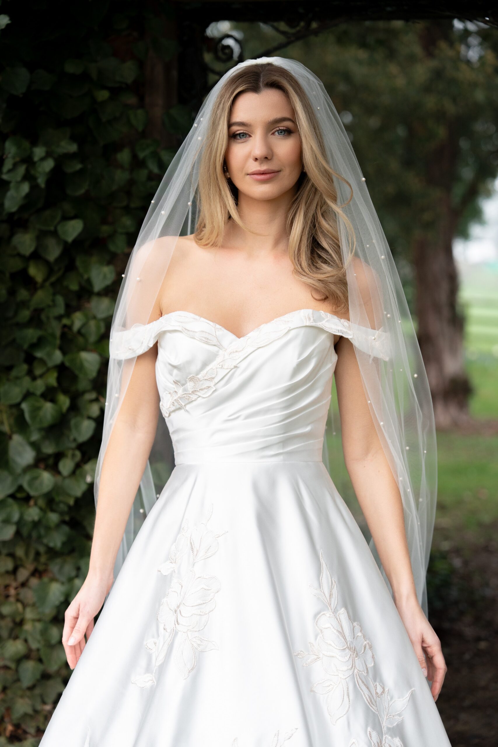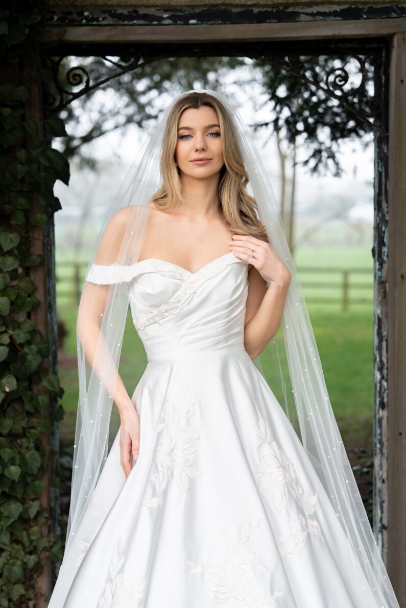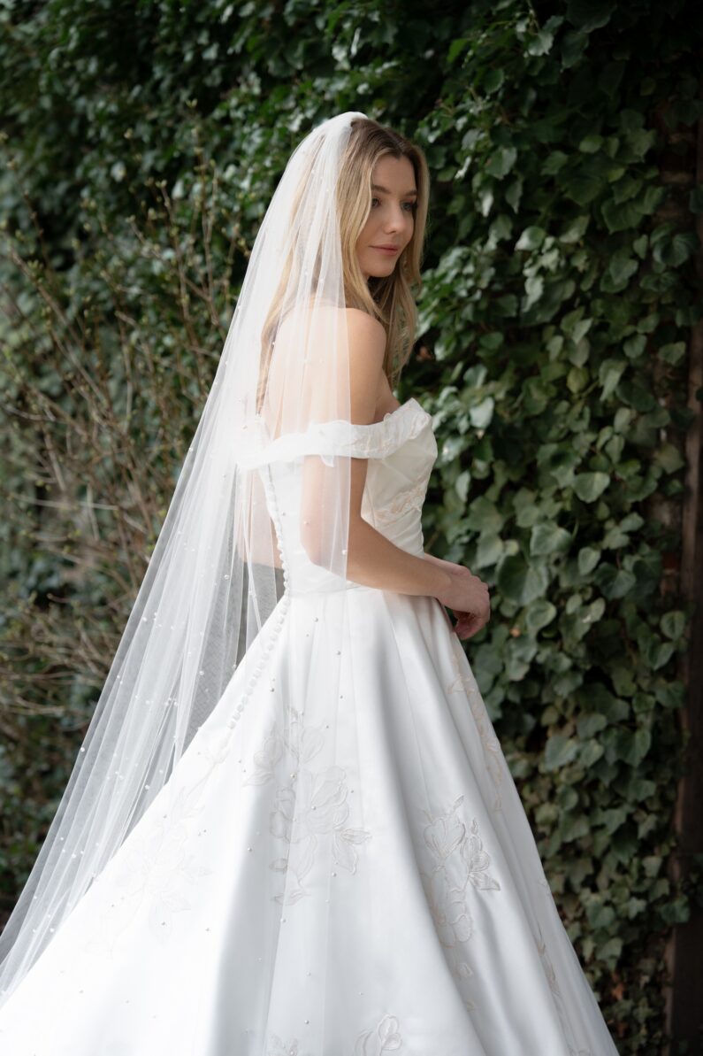 Stand out from the crowd in this stunning blush toned pearl veil. Two sizes of Cream Rose pearls are scattered across Ivory tulle for a dreamy pastel toned accessory fit for a princess, a perfect match for any of our Blossom Blush toned dresses. Available in any of our single tier and two tier veil lengths, Shown in our 98″ single tier length.