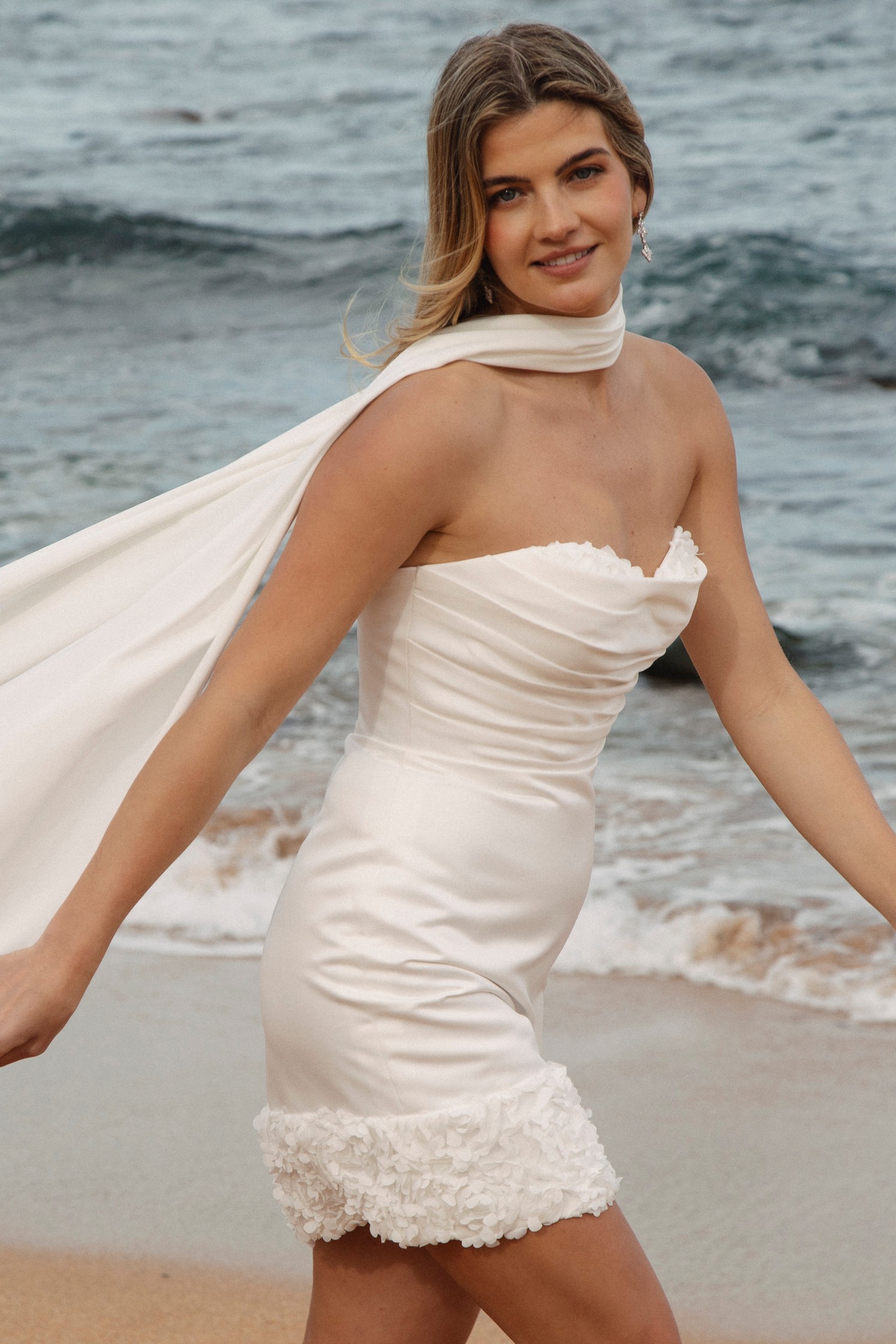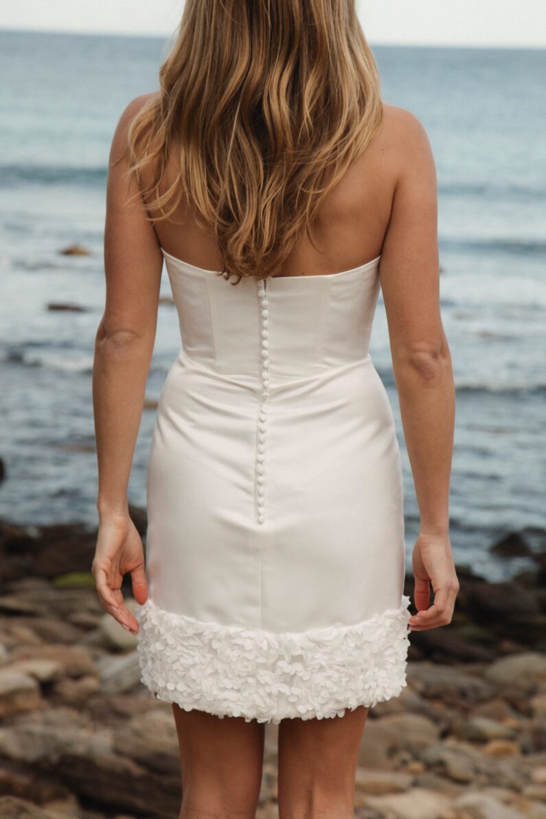 Look chic and sophisticated in our gorgeous Bobbi mini. This dress is made from matte Satin, and features a band of 3D petals at the hem, lightly mirrored just above the sweetheart neckline. Gorgeous pleating drapes across the bust effortlessly. This dress fastens at the back with a regular zip and has Satin covered buttons from the back neckline down to the end of the zip. This dress is available in Ivory only.