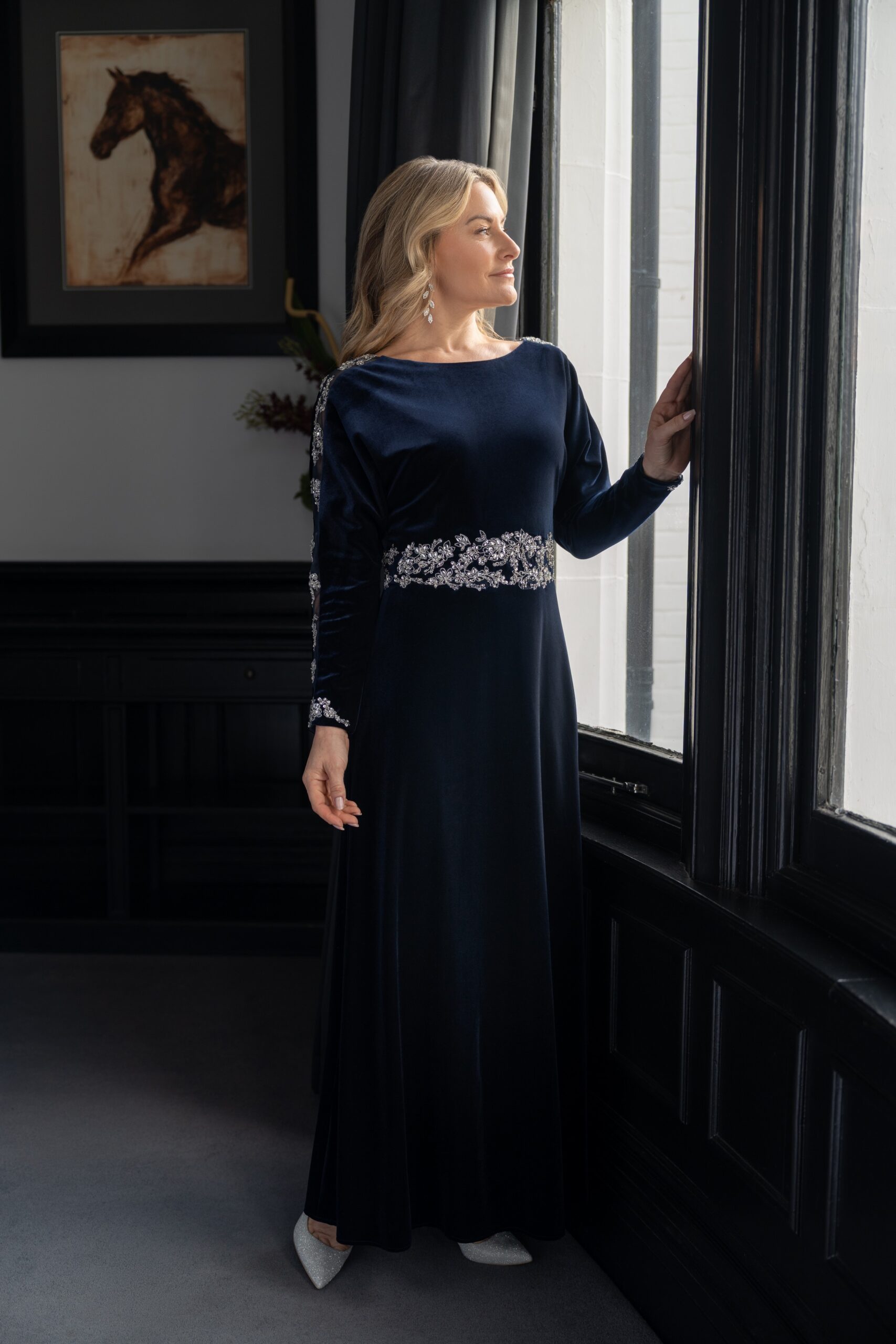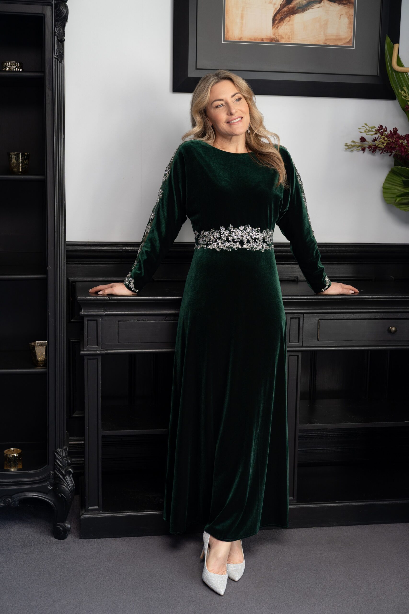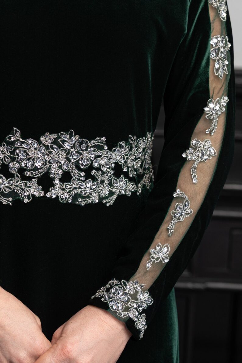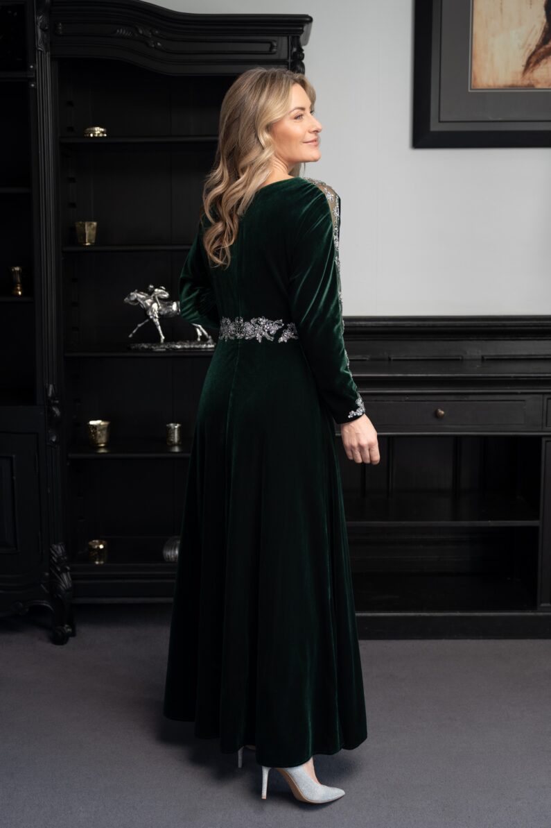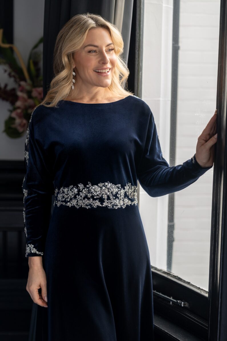 Effortlessly chic and beautifully flattering, this style features dolman sleeves ideal for fuller sizes and larger busts. Luxurious soft touch velvet is enhanced with silver hand beading at the waist and sleeves. Perfect for evenings and winter events, a very special dress for making special memories. Fully lined and finished with a centre back zip, this timeless design is Photographed for you in Navy and in Emerald, also available to order Damson. Our Model is 5’6″ and wears size 10.