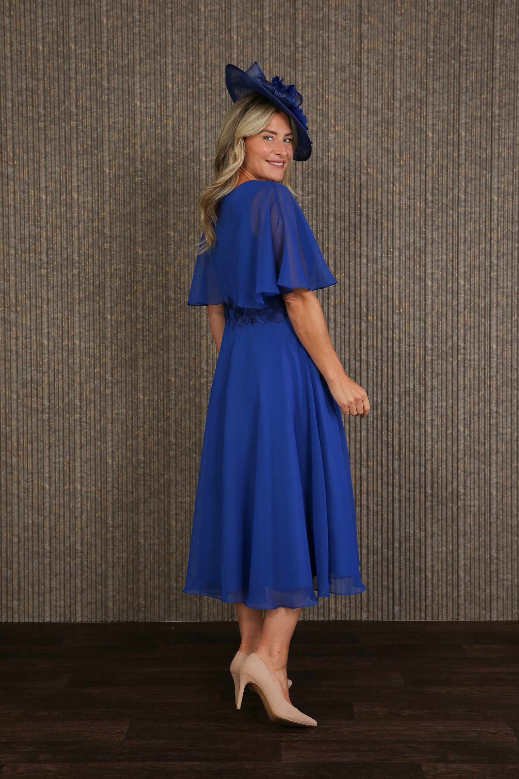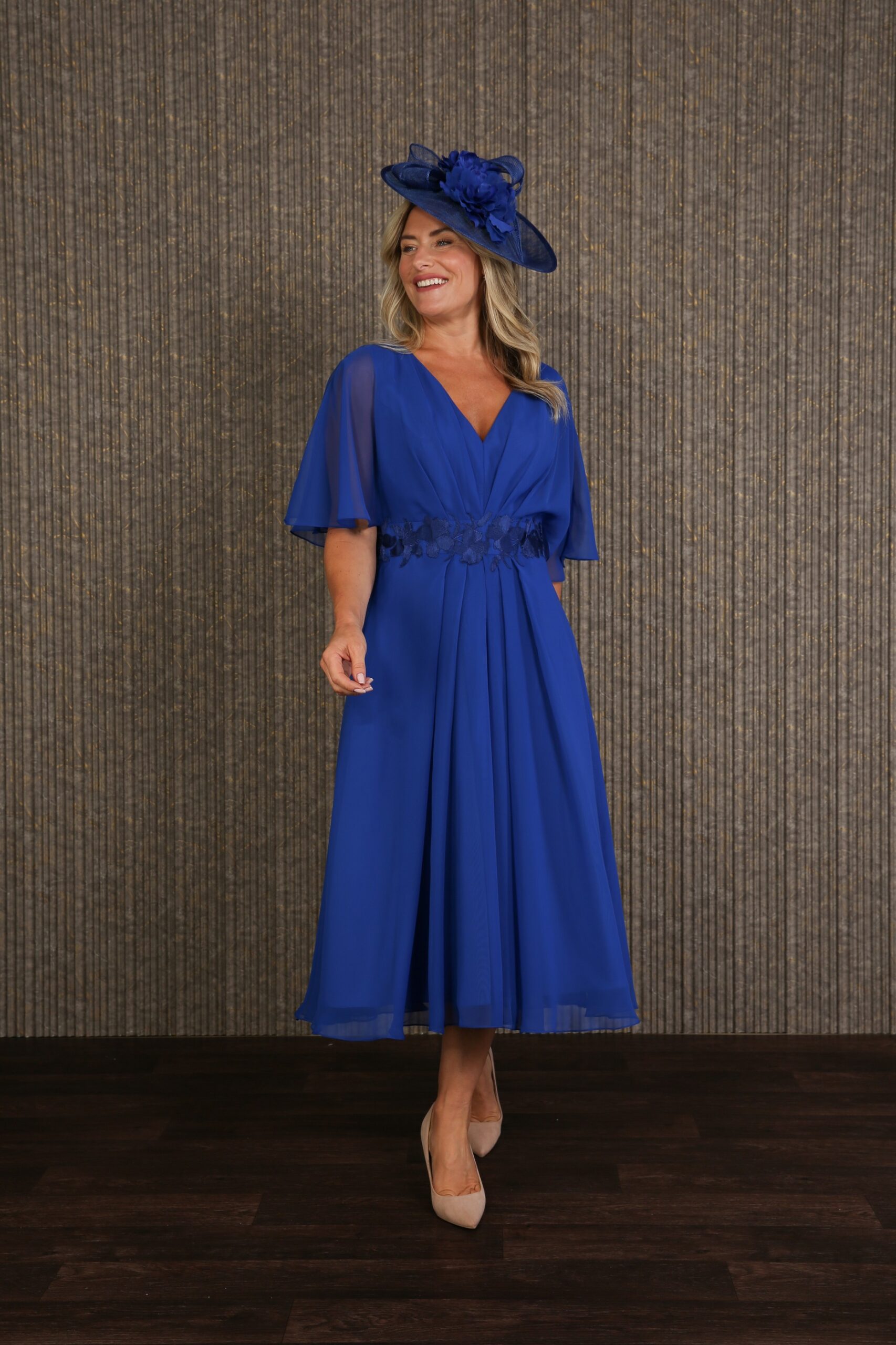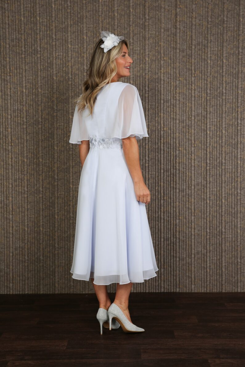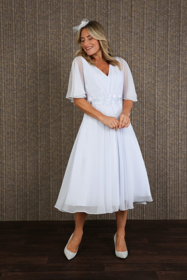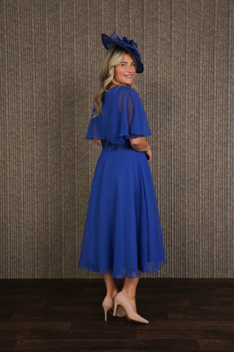 Fine pleating creates a figure enhancing silhouette in the delicate Charis dress. Smooth, lightweight, and effortlessly chic, perfect for summer events with soft semi-sheer sleeves that drape so gracefully. A double lining of fine woven fabric ensures that you stay looking and feeling perfect all day long. Matching coloured embroidery is artistically arranged all around the waistline for a cinched in effect. Fastened at the centre back with a concealed zip and measuring approximately 28″ from waist to hem, we have photographed the Charis dress for you in Crystal Blue and Royal Blue. Available to order in all our chiffon colours. Our model is 5’6″ and wears size 12.