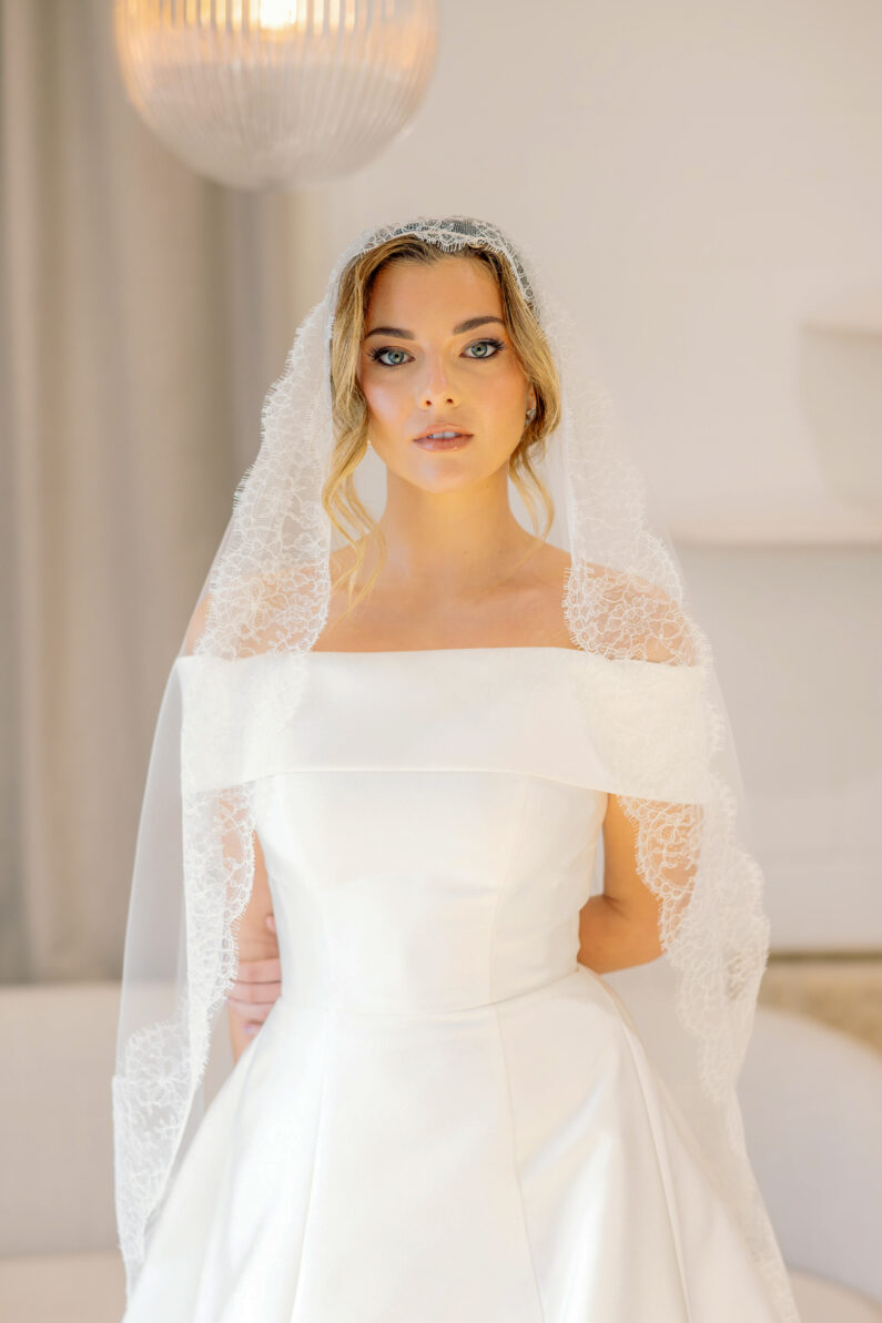Make an entrace with this stunning eyelash lace mantilla veil, the delicate florals and scallops gently cascade around each other creating an on trend chantilly style look. Perfect for wearing with plainer dresses for a classic and sleek look. Available in any of our mantilla sizes.