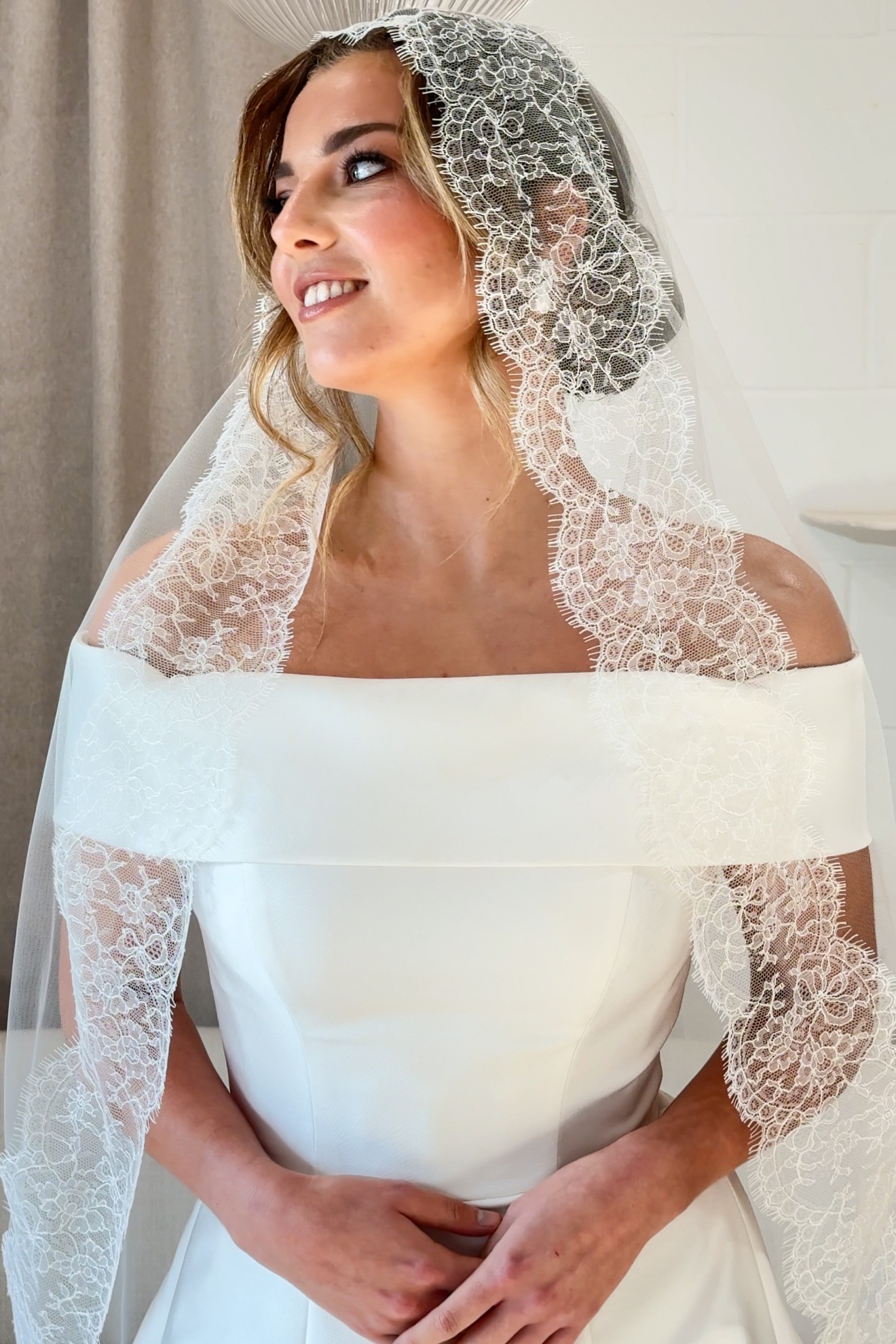 Make an entrace with this stunning eyelash lace mantilla veil, the delicate florals and scallops gently cascade around each other creating an on trend chantilly style look. Perfect for wearing with plainer dresses for a classic and sleek look. Available in any of our mantilla sizes.