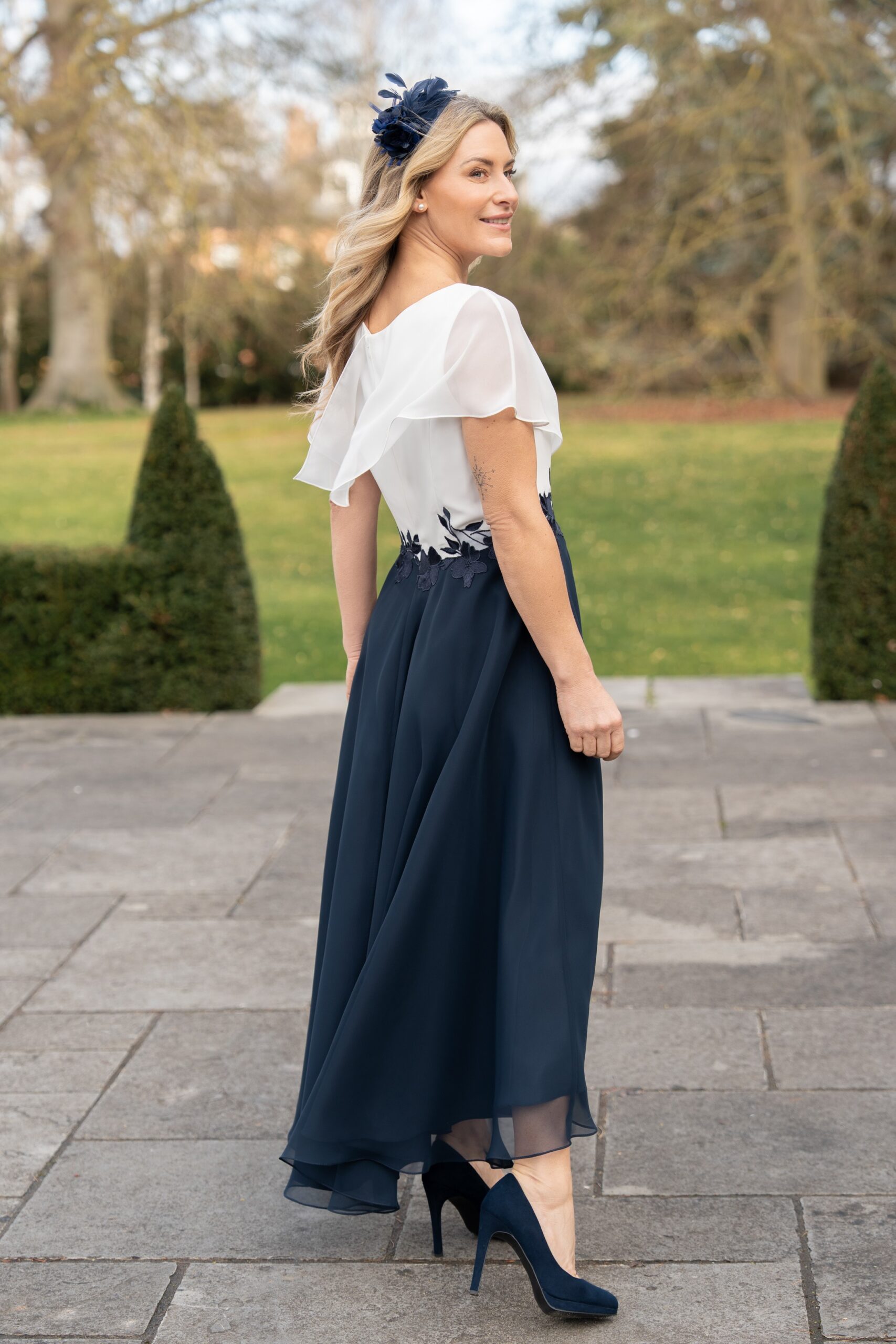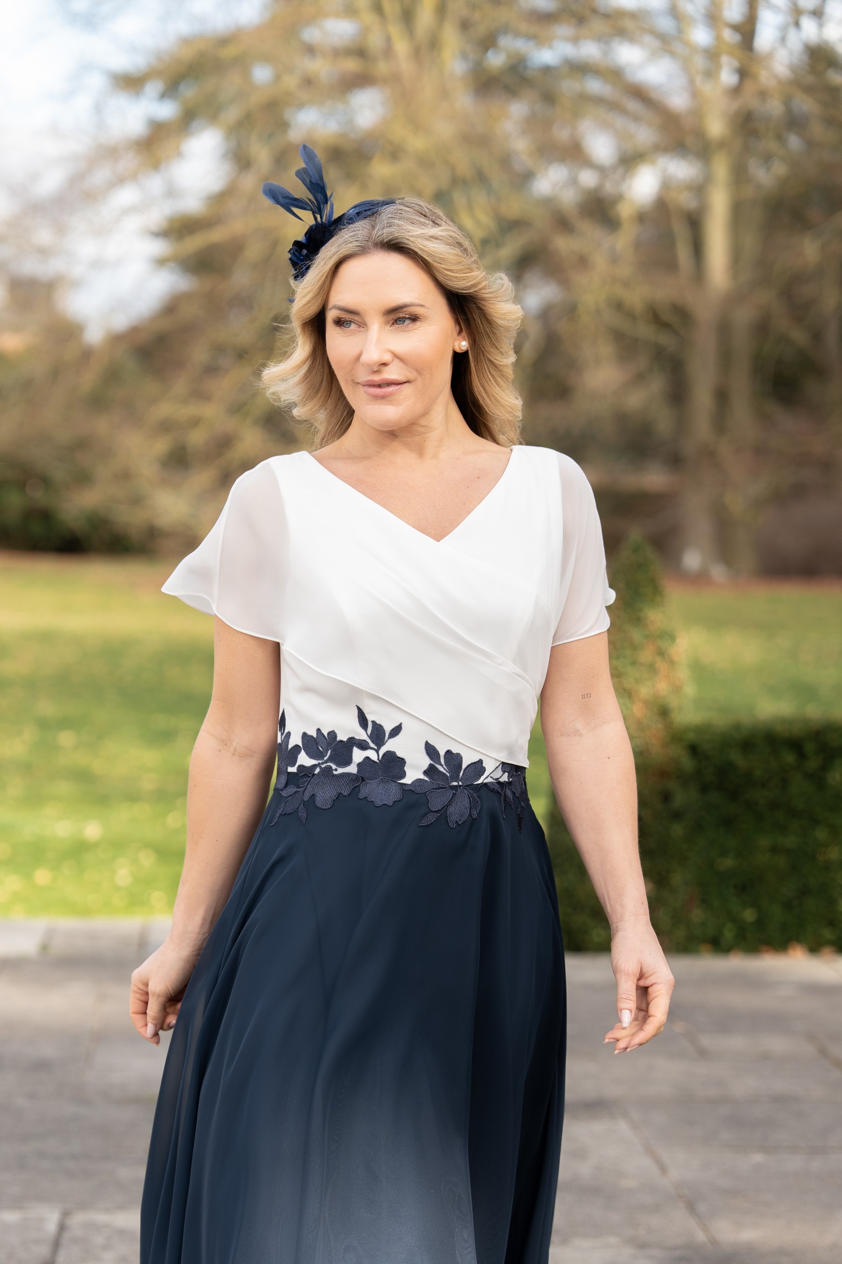 Chic and seriously comfortable chiffon style with easy to wear neckline draping gracefully into a soft flutter sleeve. Our signature high low hem brings graceful movement you’ll reach for again and again. Double lined and fastened with a centre back zip. Photographed in Silk White/Navy, also available in Navy/Summer Nights, and all plain chiffon colours. Our Model is 5’6″ and wears size 10.