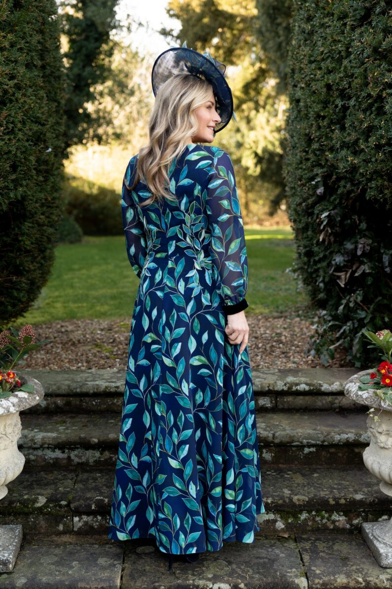 Balancing structure and softness, Lindsay pairs a high waist with a long, swishing chiffon skirt. Velvet accents and complementing embroidery elevate the look for year round events. Fully lined and finished with a concealed centre back zip; photographed in Jasmine Gold. Our Model is 5’6″ and wears size 10.