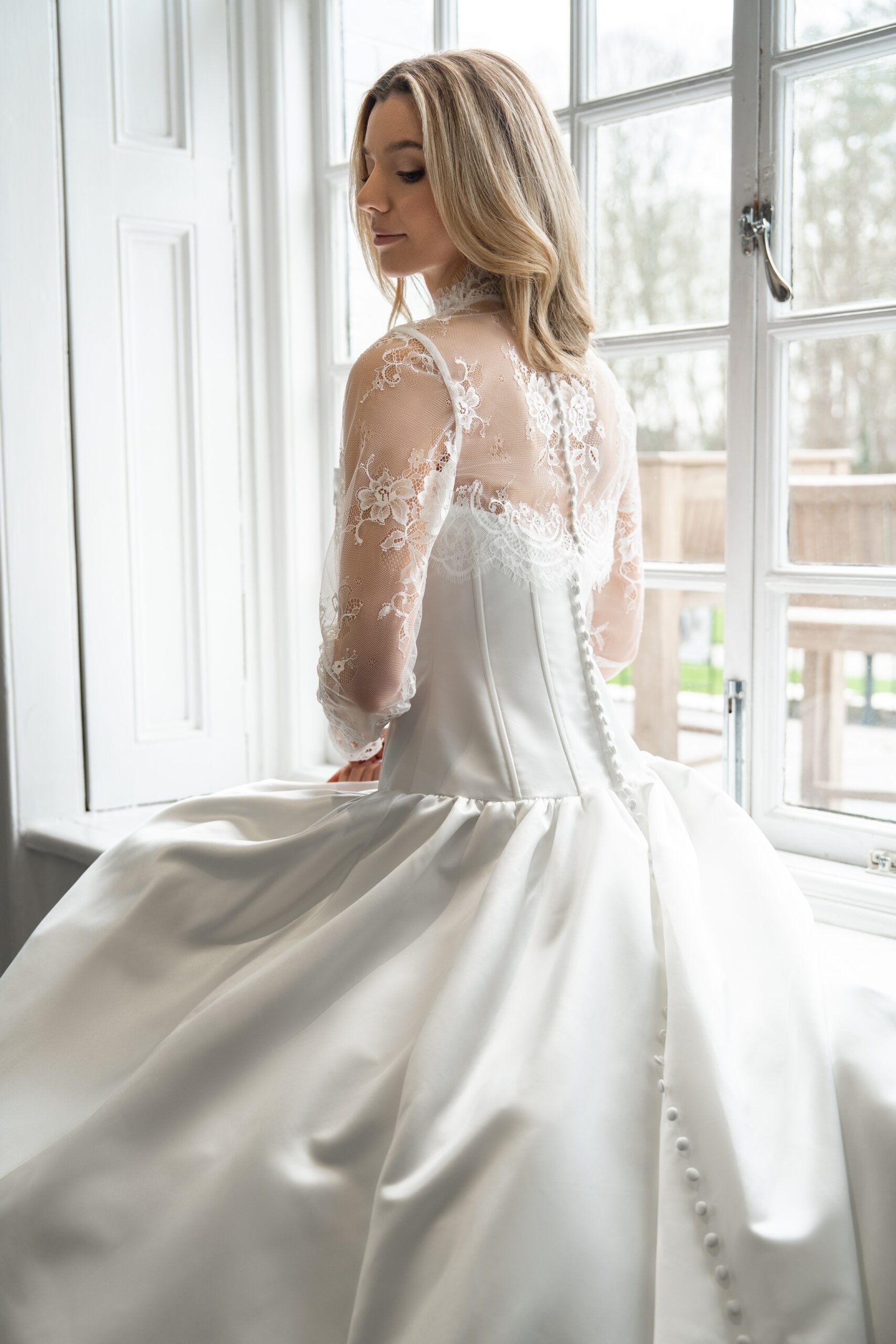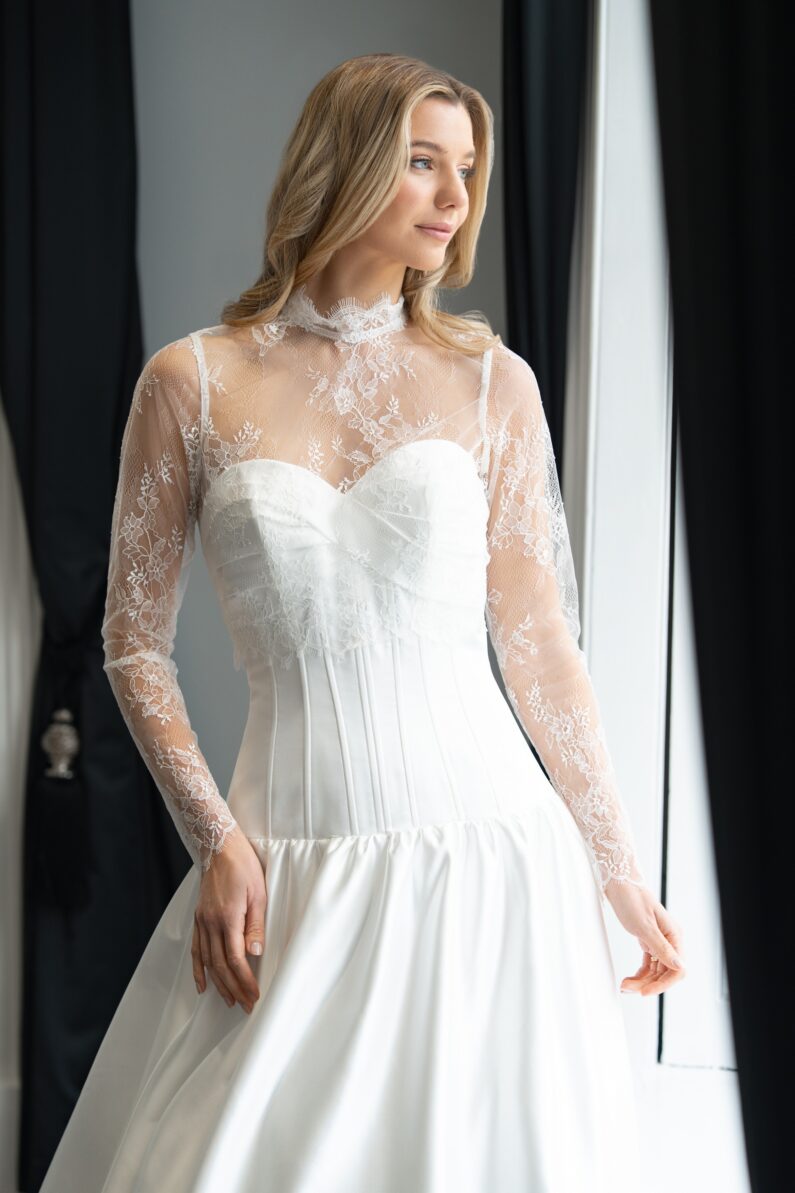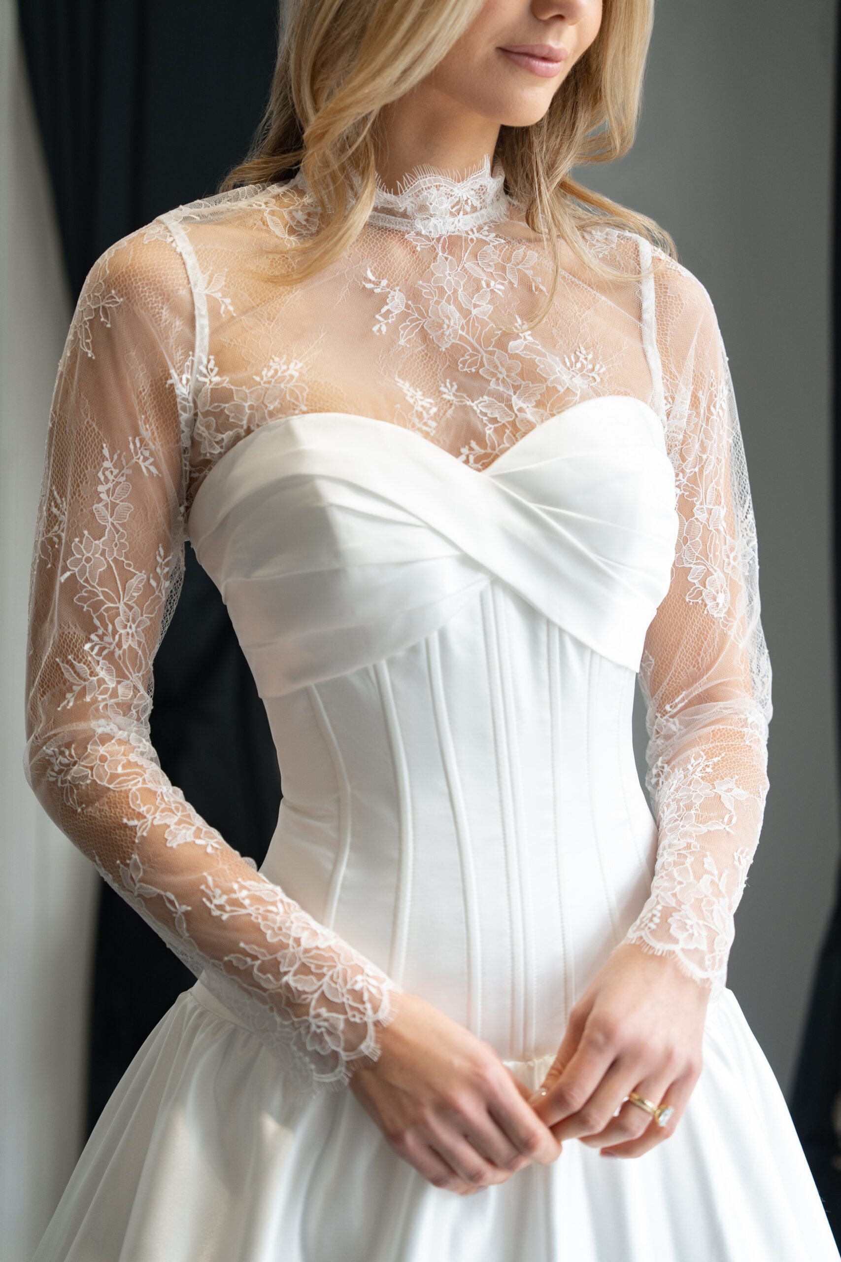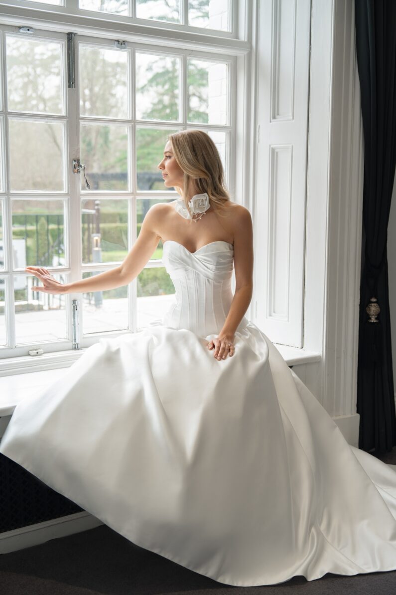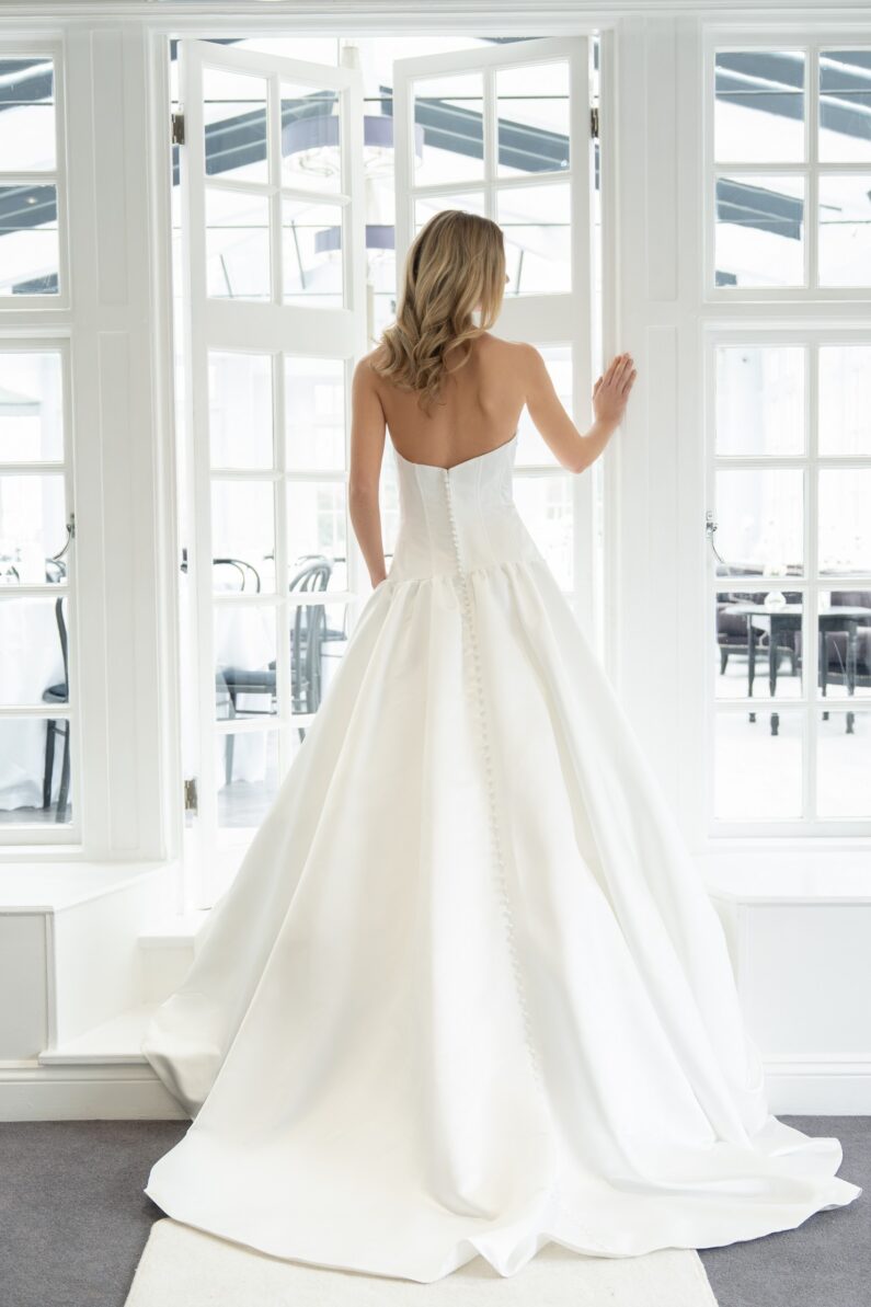Montaria is our super modern strapless ballgown with Basque waistline. A gorgeous pleated twist forms the bust detail on the front of this dress, whilst extensive boning offers structure and support, as well as extra detail. Gathering at the skirt adds more volume to the ballgown, which also features a long train. This dress fastens at the back with a zip, and has satin covered buttons from the back neck, all the way down the hem. This dress is available to order in Ivory.