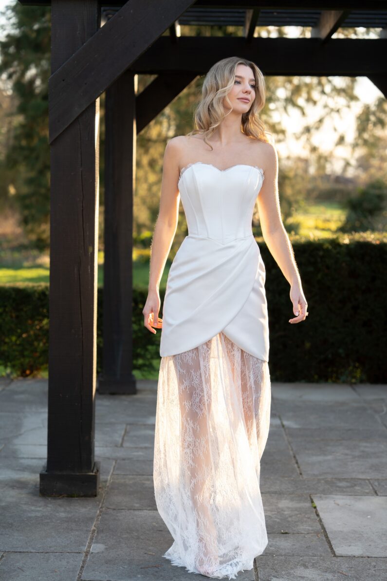 Nice is our sweet and simple mini, made fully of smooth satin. Its strapless style flatters the figure, and the cute, full skirt makes it so much fun to wear! Light pleating to the front neckline complements the body, and the curved pleats in the skirt, and gathering to the sides, adds more volume. This dress fastens at the back with a zip and has satin covered buttons from the back neck to the end of the zip, and is available to order in Ivory.