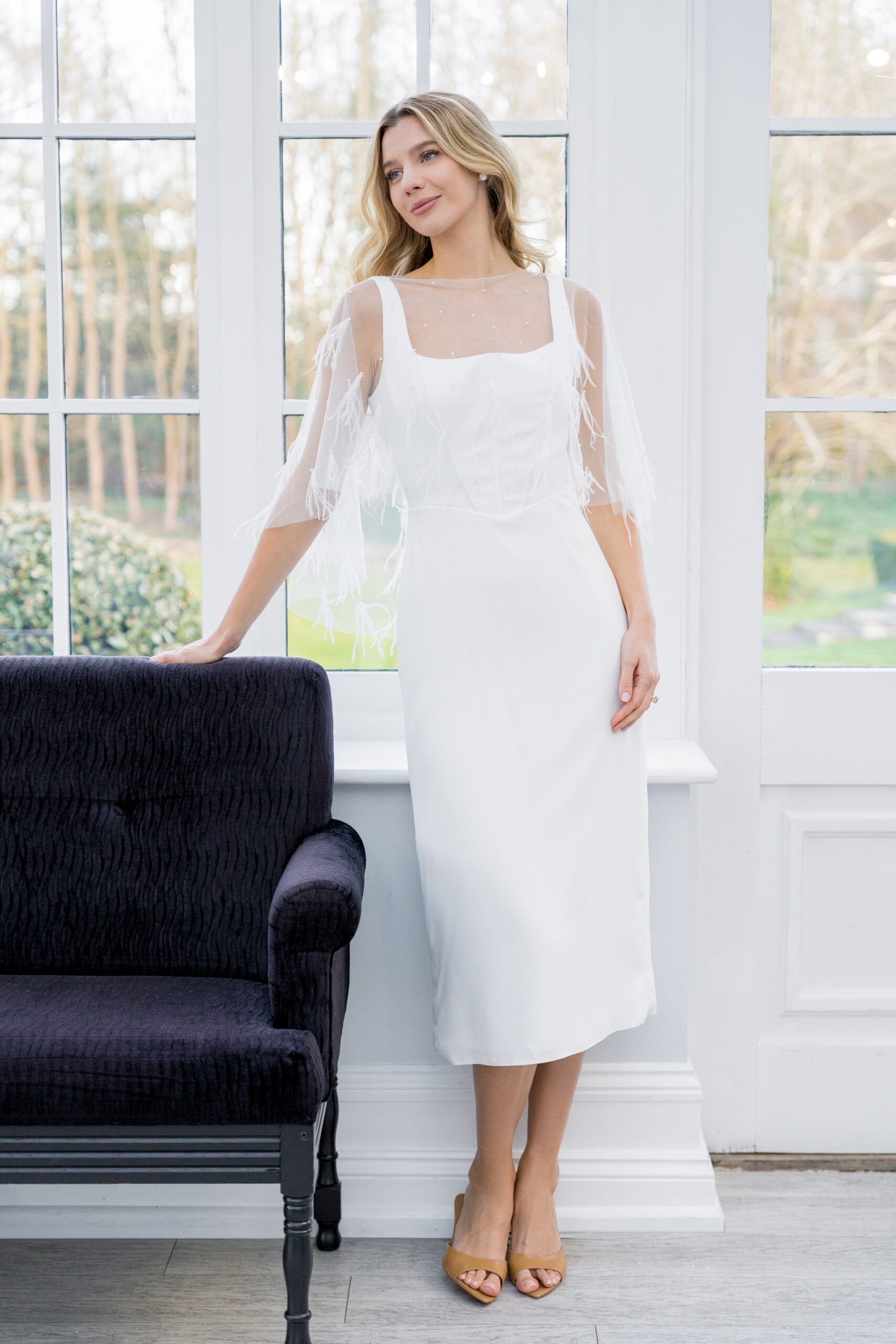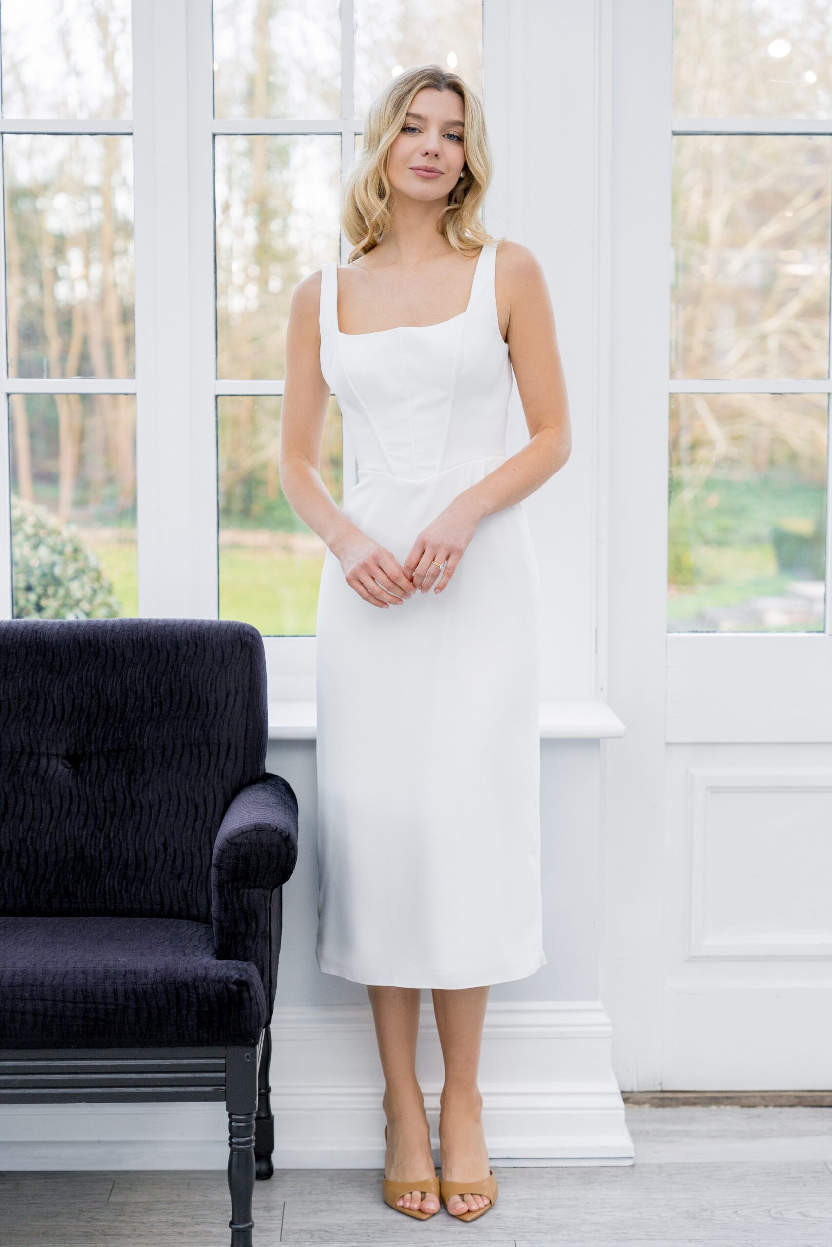 Noa is one of our beautiful midi length dresses, made from our luxurious stretch crepe. An on trend square neckline to the front and a deep scoop to the back neck, alongside exposed boning, creates the body of this dress. A simple V waist leading to a fitted, 33″ long skirt, and small slit at the centre back hem complete the dress. Princess seams to the back skirt help enhance the figure, whilst a smooth front skirt keeps the dress chic. This dress fastens at the back with a zip and crepe covered buttons from the back neck to the end of the zip. This dress is available to order in Ivory.