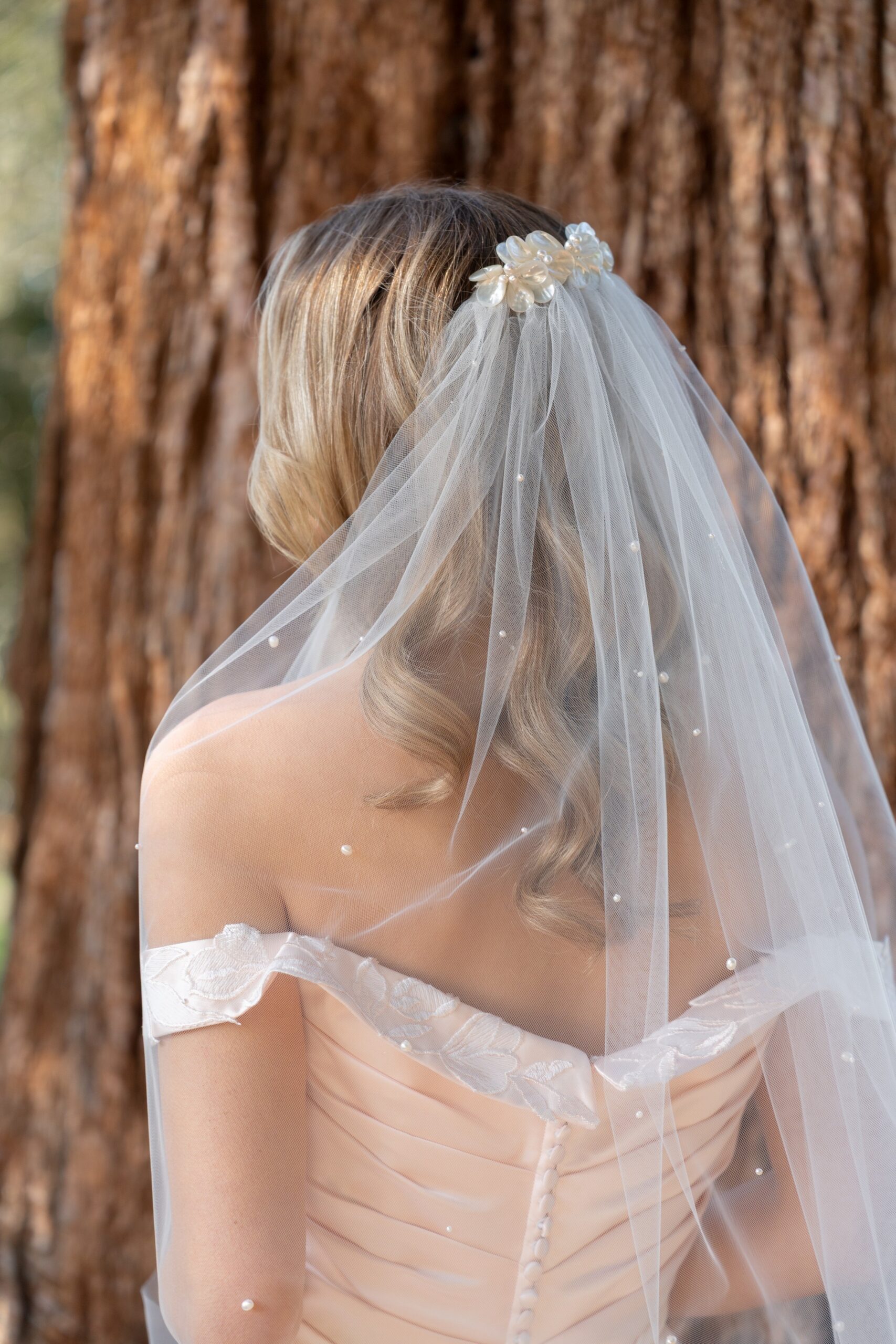 Add some floral beauty to your bridal look with this shimmering flower veil, The delicate shell flowers create a unique, nature-inspired look, clustered together at the comb creating a stunning hairpiece detail. Each shell petal has been meticulously hand wired to the comb ensuring that each flower is perfectly shaped, clustered freshwater pearls add an elegant detail in the comb and are scattered down the veil for an extra shimmering handcrafted touch. Available in any of our single tier veil lengths, shown in our 43″ single tier length.