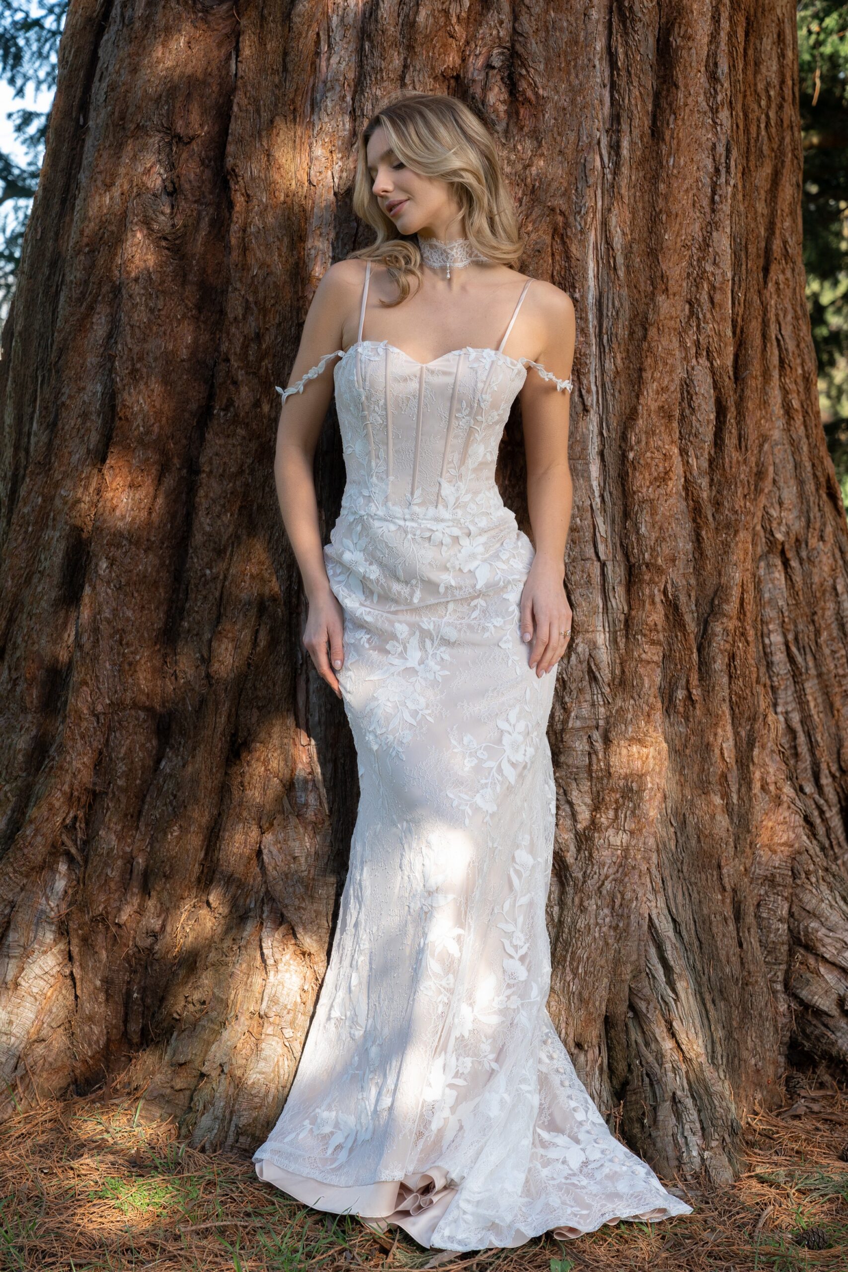 Evoke a sense of elegance with this stunning choker, made up of stunning French lace with a satin tie up fastening, two pretty beaded appliques finish off each side at the back to add an extra detail, and a singular pearl drop at the centre front acts as the main feature, drawing your eye to the exquisite lace detailing. This choker would work well paired with many bridal looks, always creating an air of timeless sophistication.