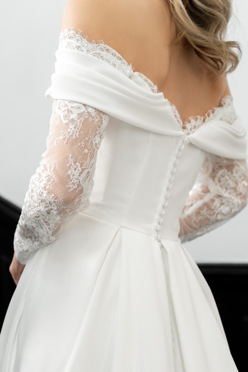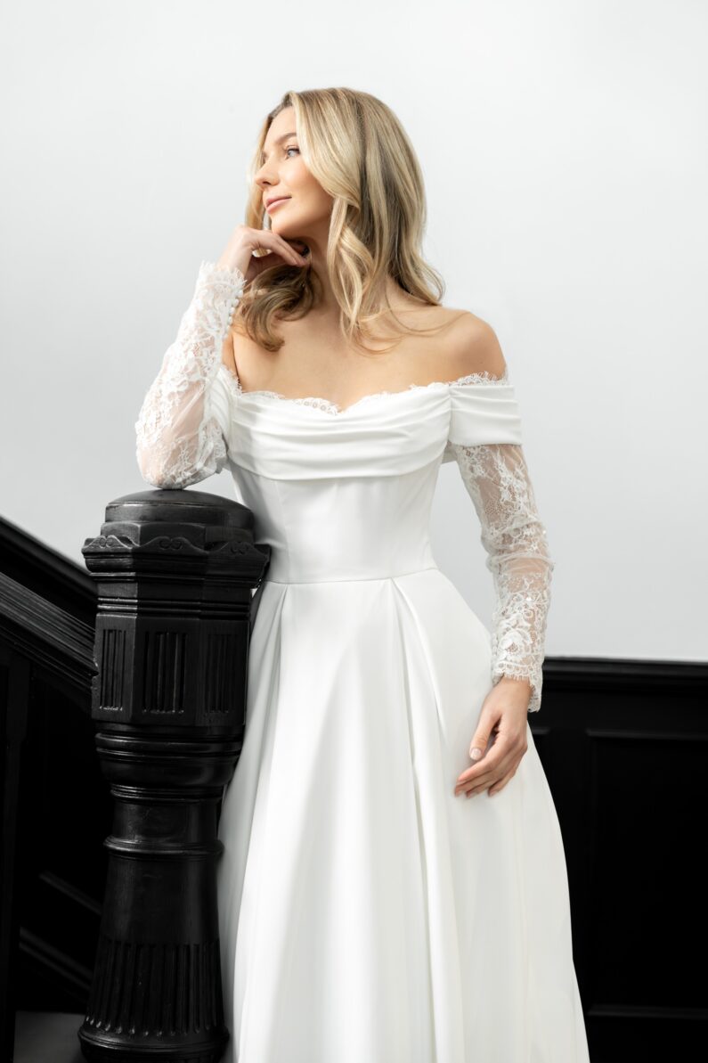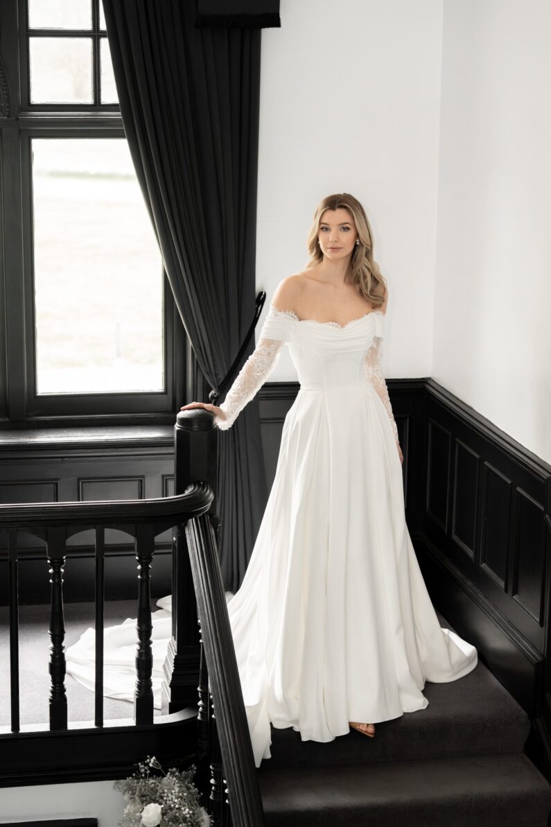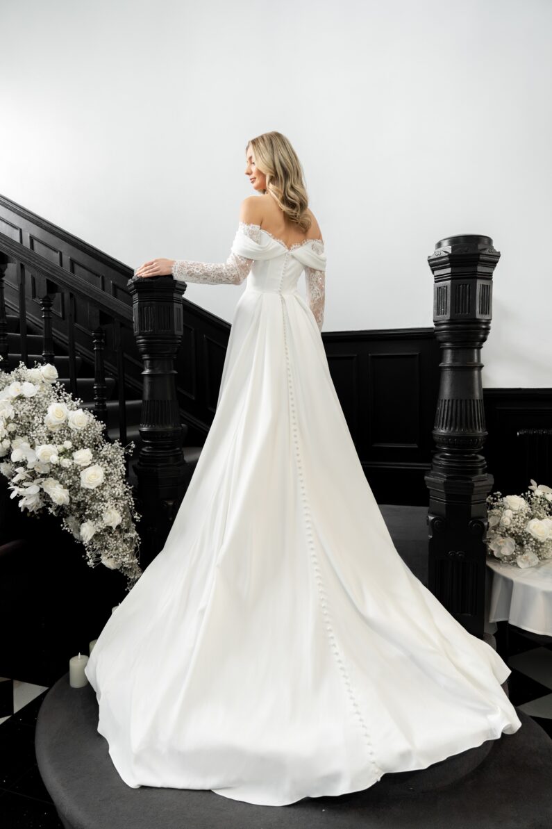 Sophia is our gorgeous ballgown with long sparkling Chantilly lace sleeves, and the most flattering drape across the shoulders and upper body. The billowing crepe ballgown skirt features box pleats to the front and back, as well as a long train. This dress fastens at the back with a regular zip and fabric covered buttons, and is available to order in Ivory.