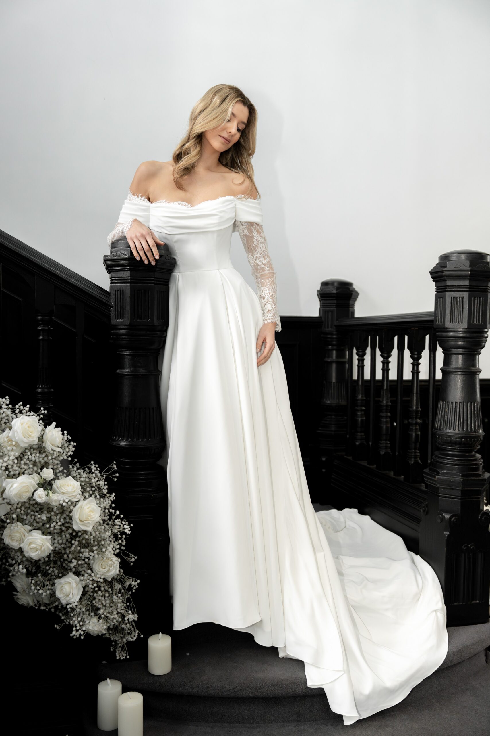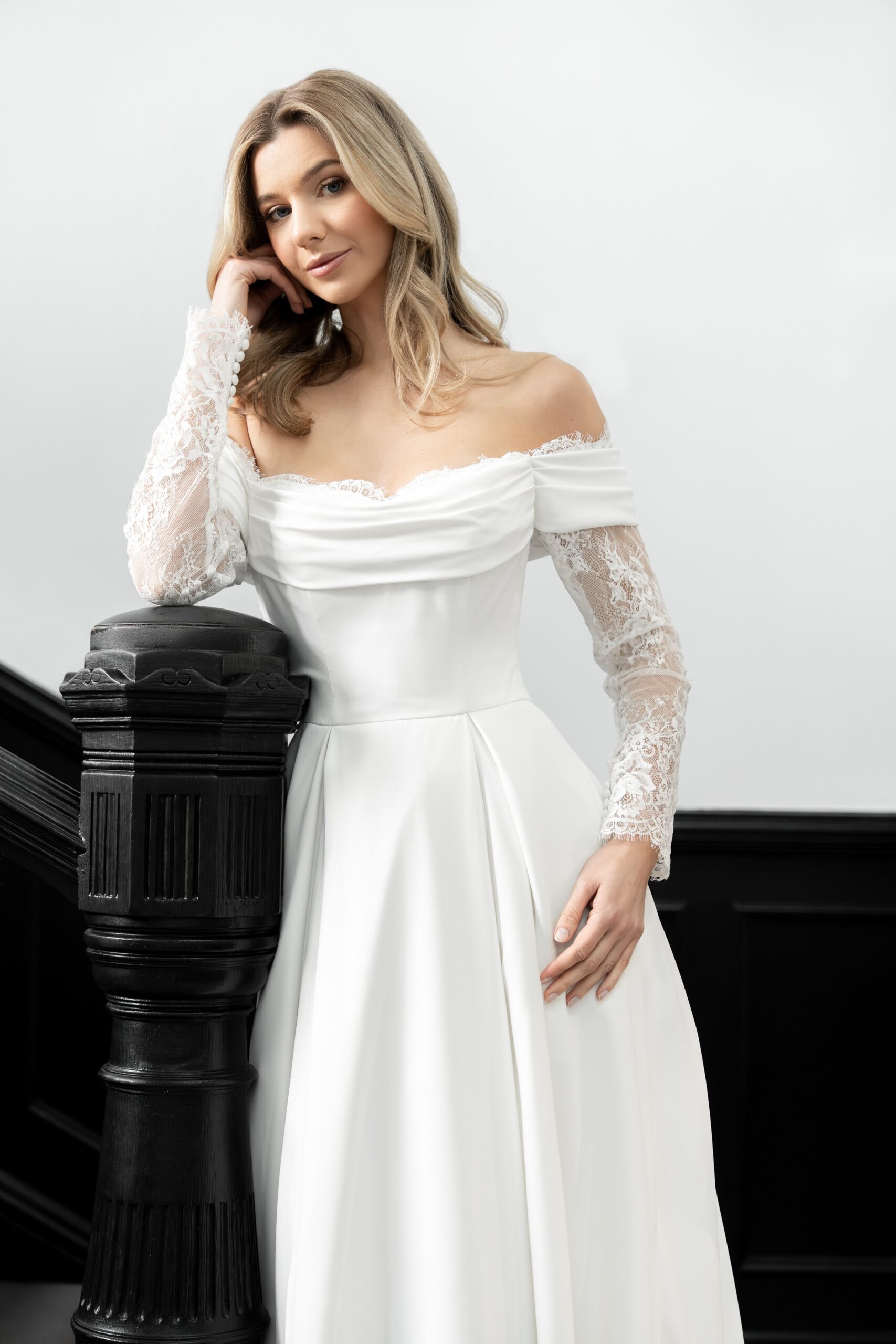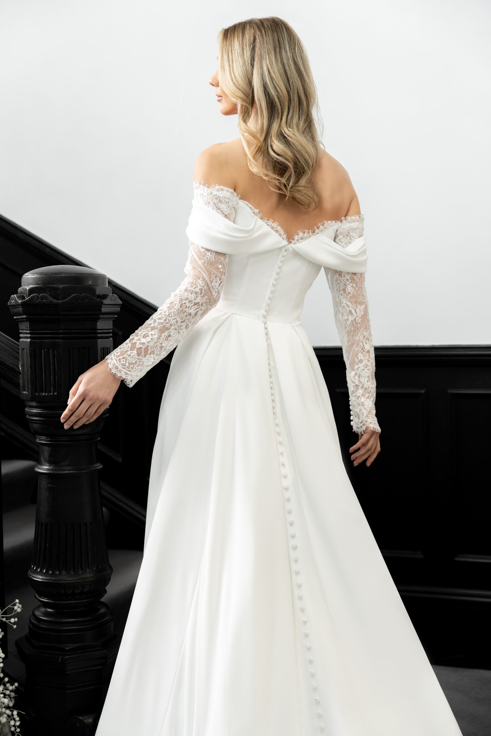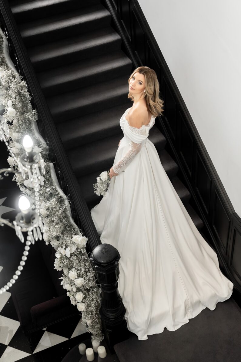 Sophia is our gorgeous ballgown with long sparkling Chantilly lace sleeves, and the most flattering drape across the shoulders and upper body. The billowing crepe ballgown skirt features box pleats to the front and back, as well as a long train. This dress fastens at the back with a regular zip and fabric covered buttons, and is available to order in Ivory.