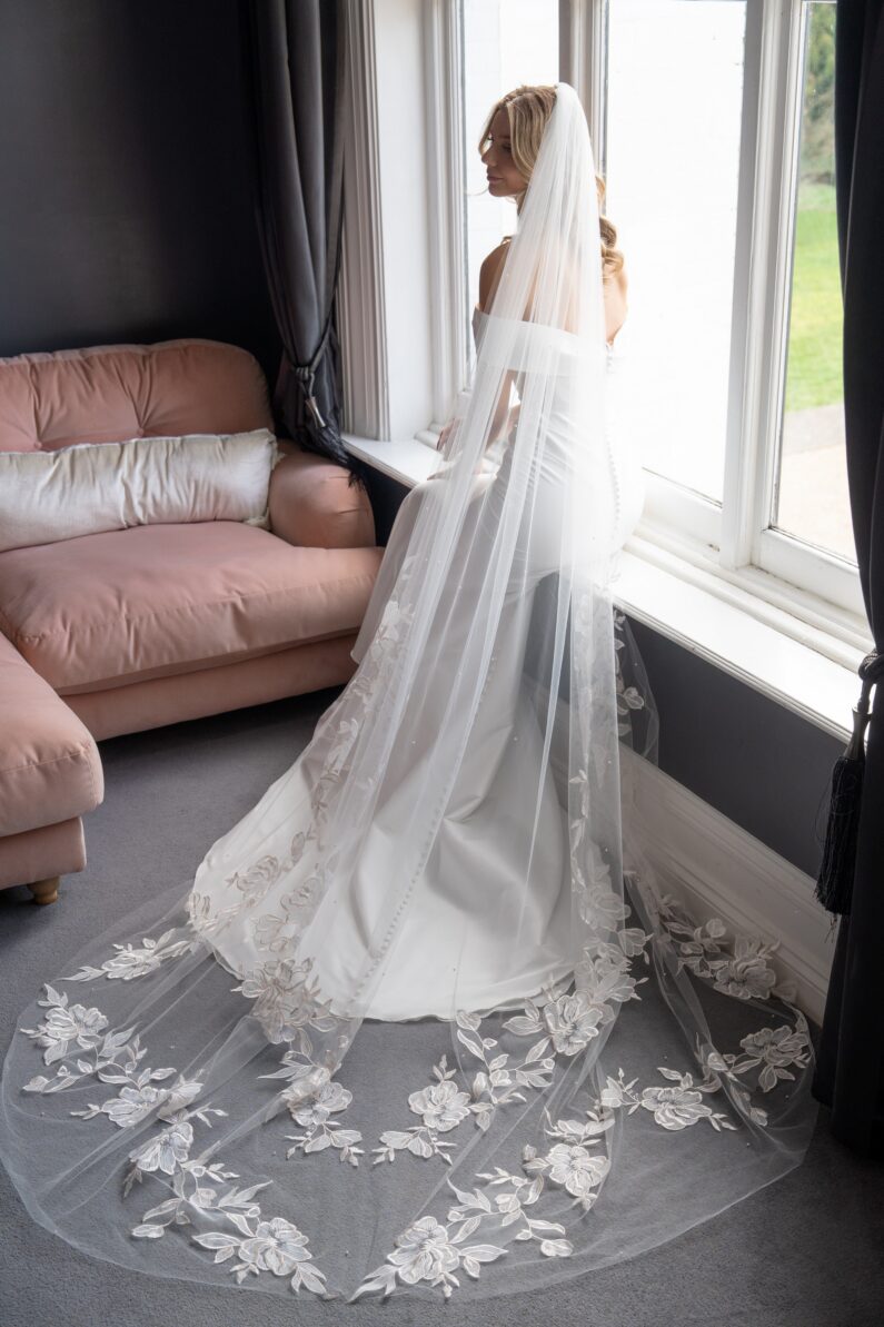 To keep your veil in pristine condition handle with care and hang up for a few days before wearing to allow creases to fall out naturally. Do not wash, steam or iron your veil as this may damage it. Not suitable for dry cleaning.